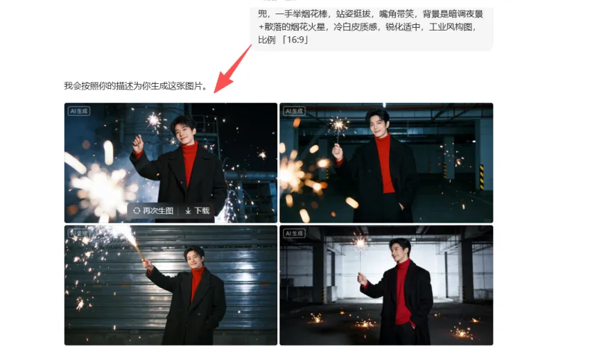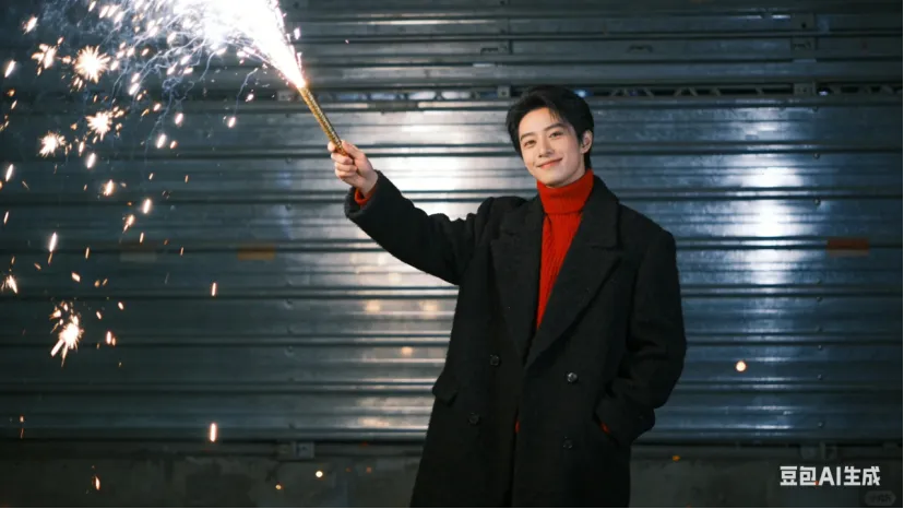 • 男生版(可复制):黑色毛呢大衣内搭红色高领毛衣,一手插兜,一手举烟花棒,站姿挺拔,嘴角带笑,背景是暗调夜景+散落的烟花火星,冷白皮质感,锐化适中,工业风构图。