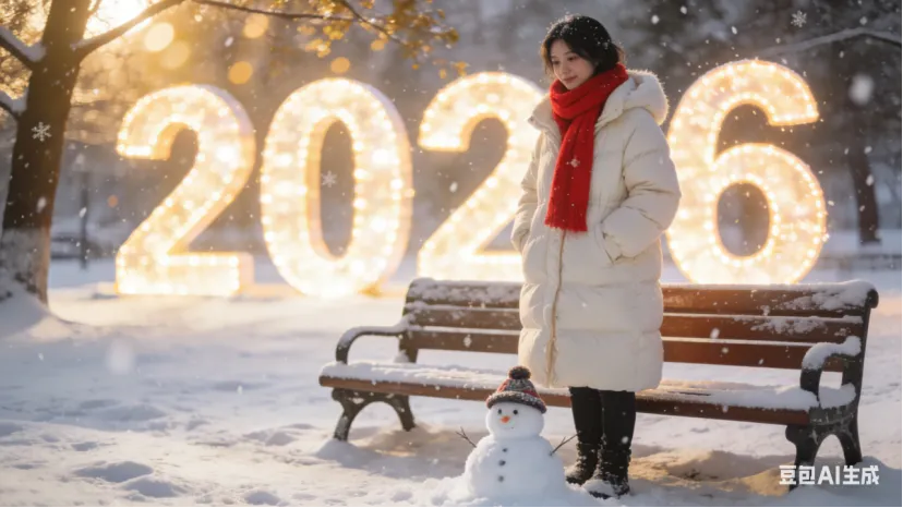 • 雪地款:身穿米白色羽绒服,围着红色围巾,站在白雪皑皑的公园长椅旁,脚边堆着小雪人,背景是巨型发光“2026”数字,雪花缓缓飘落,阳光透过树枝洒下光斑,清新治愈风,