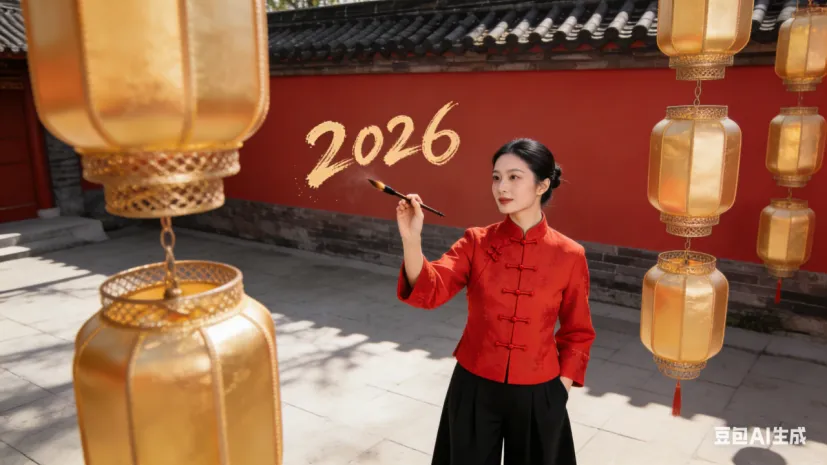 • 中式潮风:身穿红色盘扣唐装,搭配黑色阔腿裤,手持毛笔在空气中“写”2026,背景是红墙黛瓦+金色灯笼,光影错落,古风与现代结合,画质细腻。
