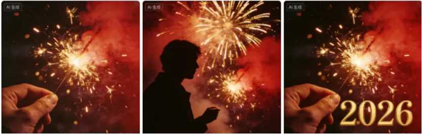 •烟花三宫格(可复制):左图:烟花特写+手部举烟花的局部镜头;中图:人物侧影+背景烟花全景;右图:金色2026数字+散落烟花火星,整体红金配色,复古胶片质感,三图统一色调,比例1:1