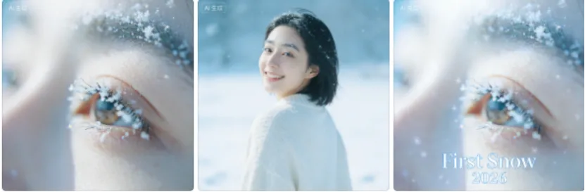 • 雪花三宫格(可复制):左图:雪花落在睫毛上的特写;中图:身穿白色毛衣站在雪地中回头笑;右图:“First Snow 2026”文字+雪花飘落动态,冷调清新风,柔焦滤镜,比例1:1。