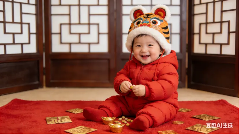• 儿童版:头戴虎头帽,身穿红色棉服,手里抓着小元宝,坐在红色地毯上,周围散落金色福字,背景是中式屏风,宝宝咧嘴笑,画质高清无噪点,可爱治愈风。