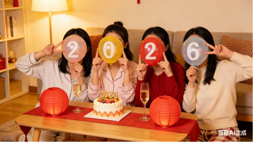 • 居家派对风:4个女生围坐在客厅,桌上摆着蛋糕、香槟杯、红色灯笼,身穿睡衣或休闲装,一起比“2026”手势,脸上带气球装饰,暖光氛围,生活化互动,温馨治愈。