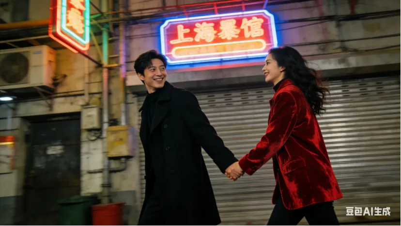 • 街头潮酷款:男生穿黑色大衣,女生穿红色丝绒外套,手牵手走在街头,男生回头看向女生笑,背景是工业风街道+霓虹灯牌,动态抓拍感,画质清晰。