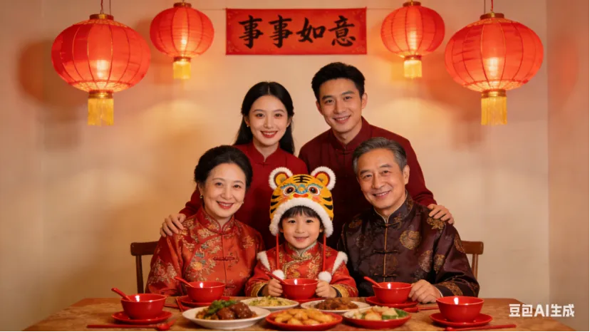 • 温馨客厅款(可复制):一家四口围坐在餐桌旁,桌上摆着年夜饭、红色餐具,长辈穿中式唐装,小孩戴虎头帽,全员微笑看向镜头,背景是红灯笼+“事事如意”横批,暖光氛围,画质细腻。