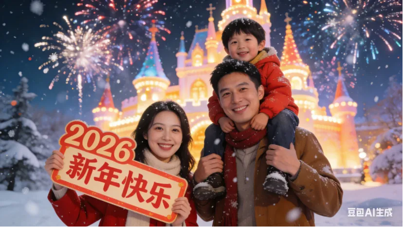 • 奇妙场景款:全家站在雪地里,身后是发光的城堡+漫天烟花,小孩骑在爸爸肩膀上,妈妈手里举着“2026新年快乐”牌子,童话风滤镜,色彩鲜艳。