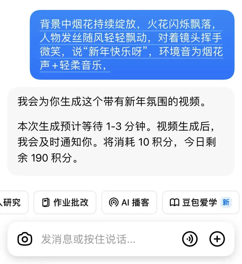 • 烟花款:背景中烟花持续绽放,火花闪烁飘落,人物发丝随风轻轻飘动,对着镜头挥手微笑,说“新年快乐呀”,环境音为烟花声+轻柔音乐,时长5秒,模型1.5 Pro。