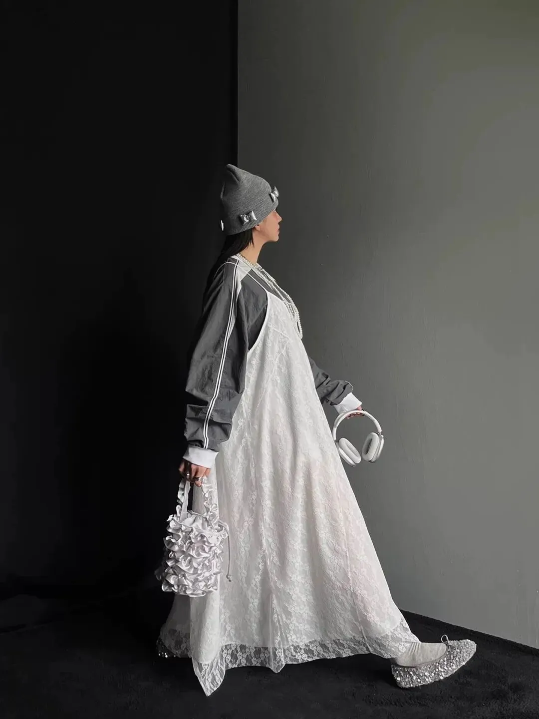 配饰方面也十分用心。灰色的针织帽与内搭上衣颜色相呼应,增加了整体造型的协调性。多层珍珠项链的佩戴,为暗黑系穿搭增添了一抹精致与优雅。手中的白色耳机和褶皱手提包,不仅是实用单品,更是时尚的点缀,让整个造型更加完整。