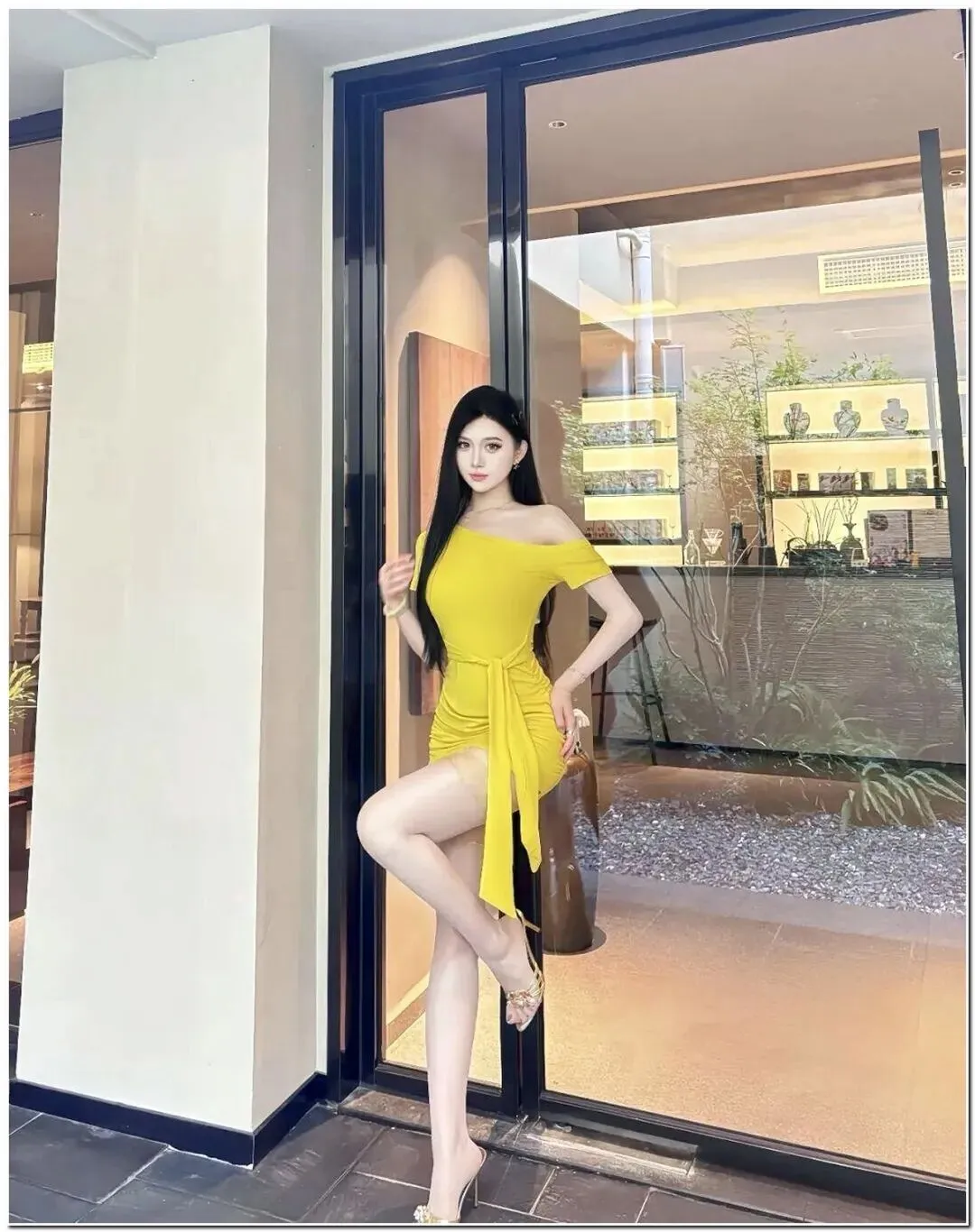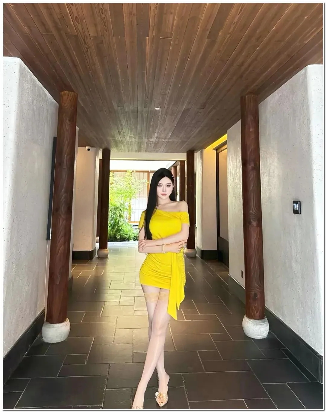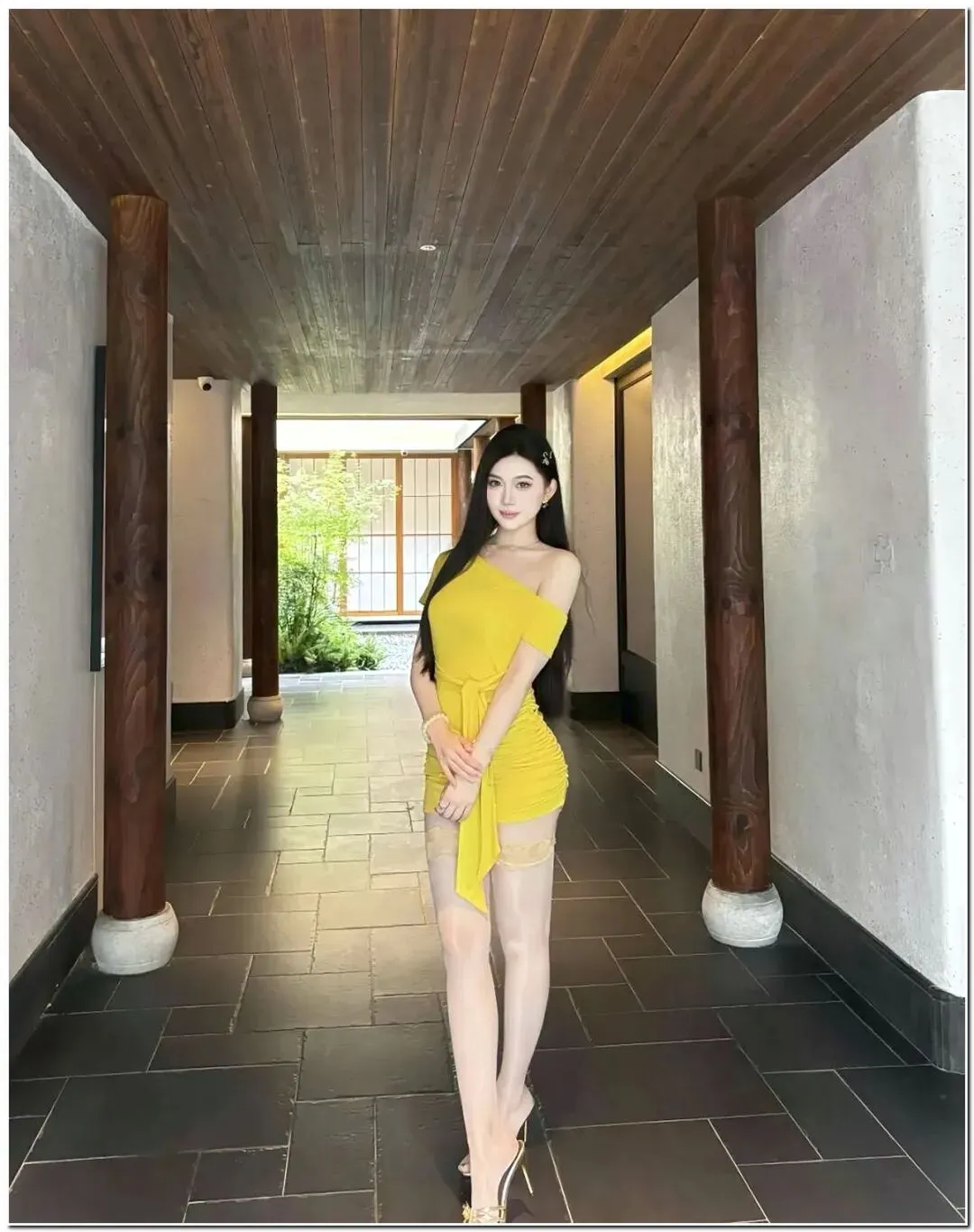 今天是走廊里的 “在逃财阀千金”~姜黄斜肩裙把直角肩露得刚好,侧边系带自带小心机,配双蕾丝透肤袜瞬间拿捏纯欲感 —— 明媚活泼和性感撩人撞得又甜又辣;薄袜 + 细跟穆勒鞋把腿拉成 “女团腿”,搭个黑长直发往那儿一站,复古庭院背景衬得这一身黄简直白到发光!