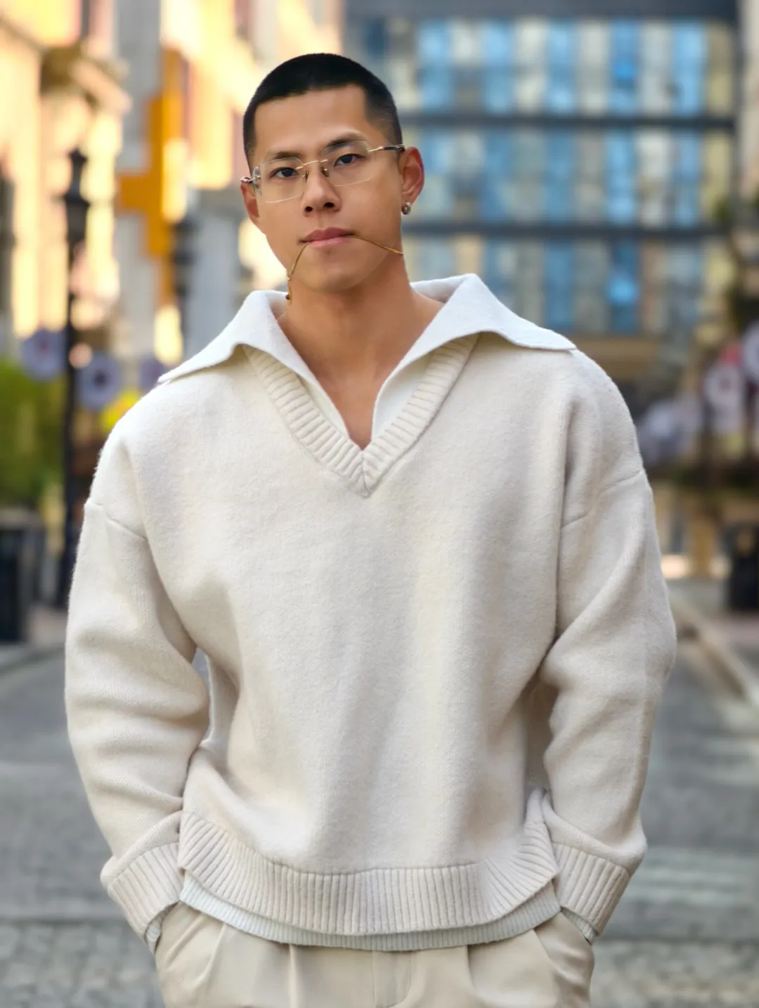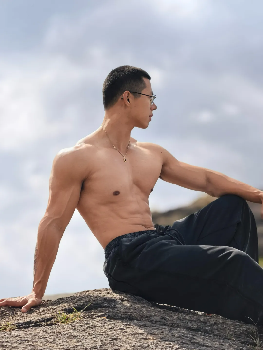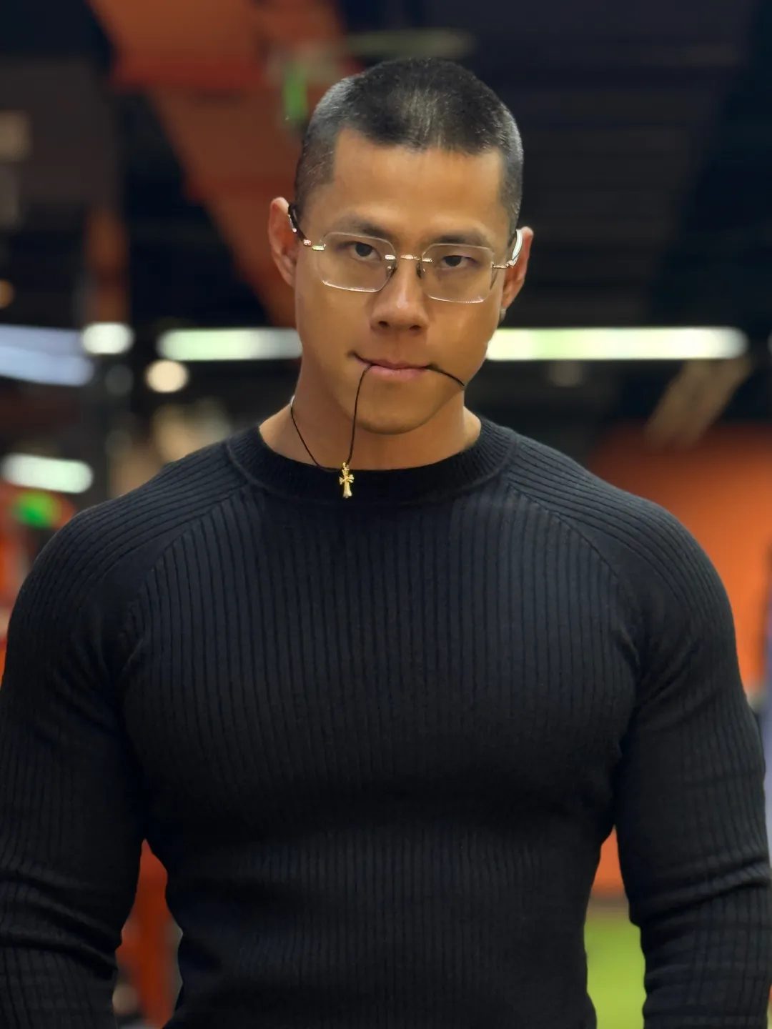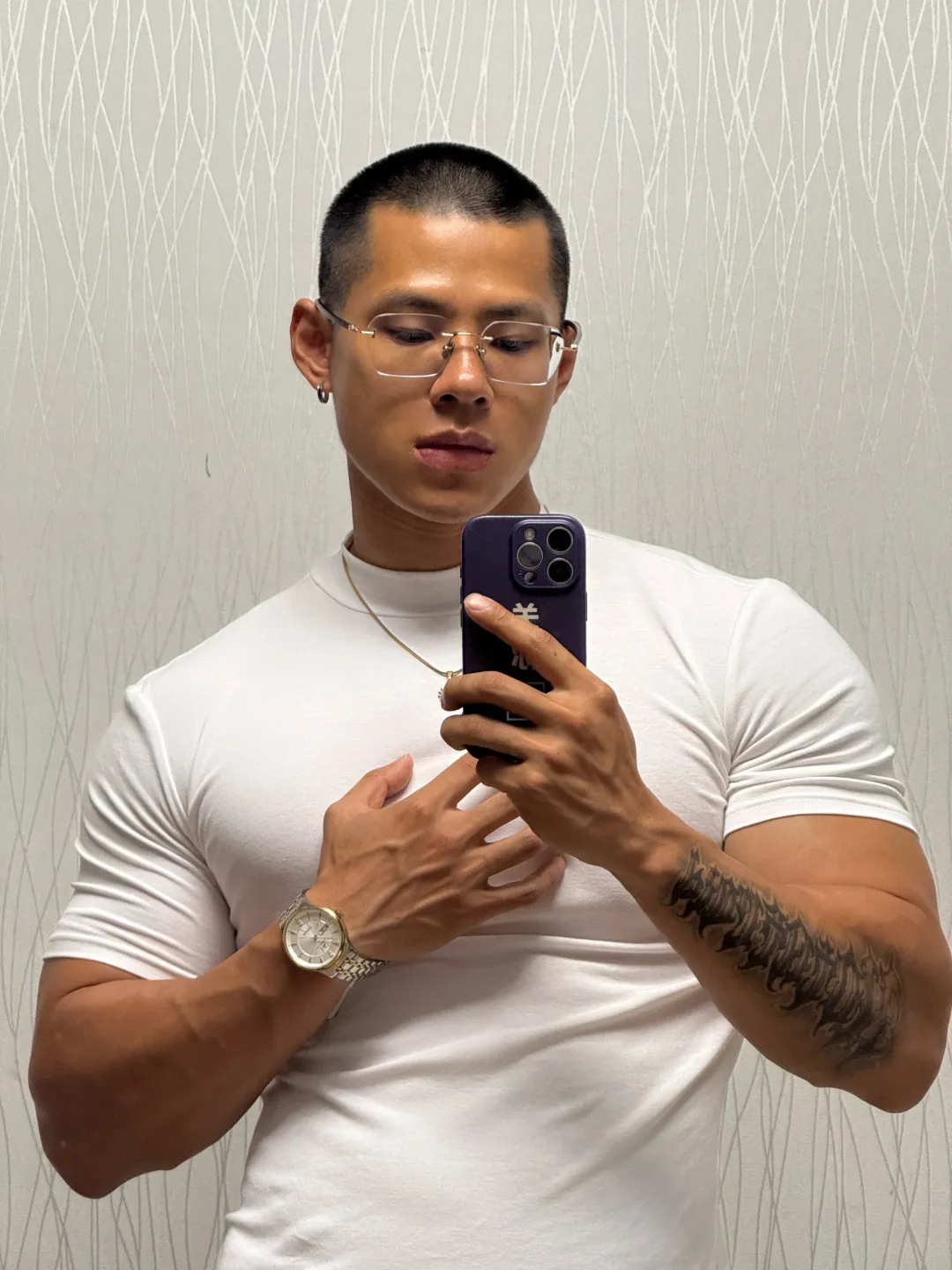 再看身材,这才是重头戏!181cm+78kg 的黄金比例,健身八年的成果不是盖的。宽肩窄腰的倒三角身材,手臂线条流畅紧实,大 V 领一穿,清晰的锁骨和胸肌线条直接杀疯,不是夸张的大块肌肉,而是充满力量感的匀称体态。穿衣是气场全开的猛男,脱衣更是藏不住的好身材,简直是理想型天花板!