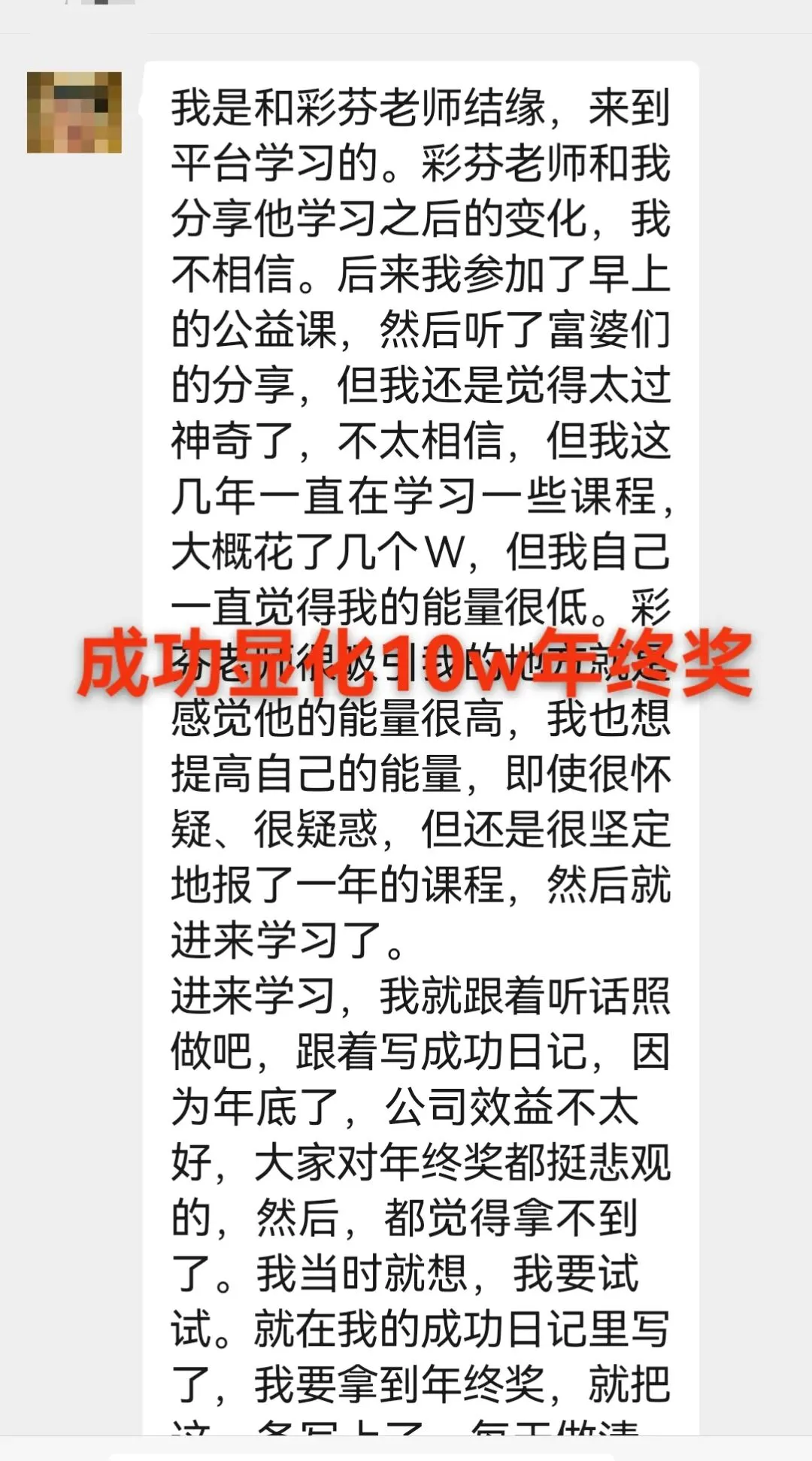 我今天分享第97位逆袭女神的故事。公司效益不好,同事们都觉得年终奖没了希望,可这位女神却不一样。她加入我们定心定神实战群开始书写成功日记,不断强化自己内心的信念,笃定地相信自己一定能拿到年终奖。
