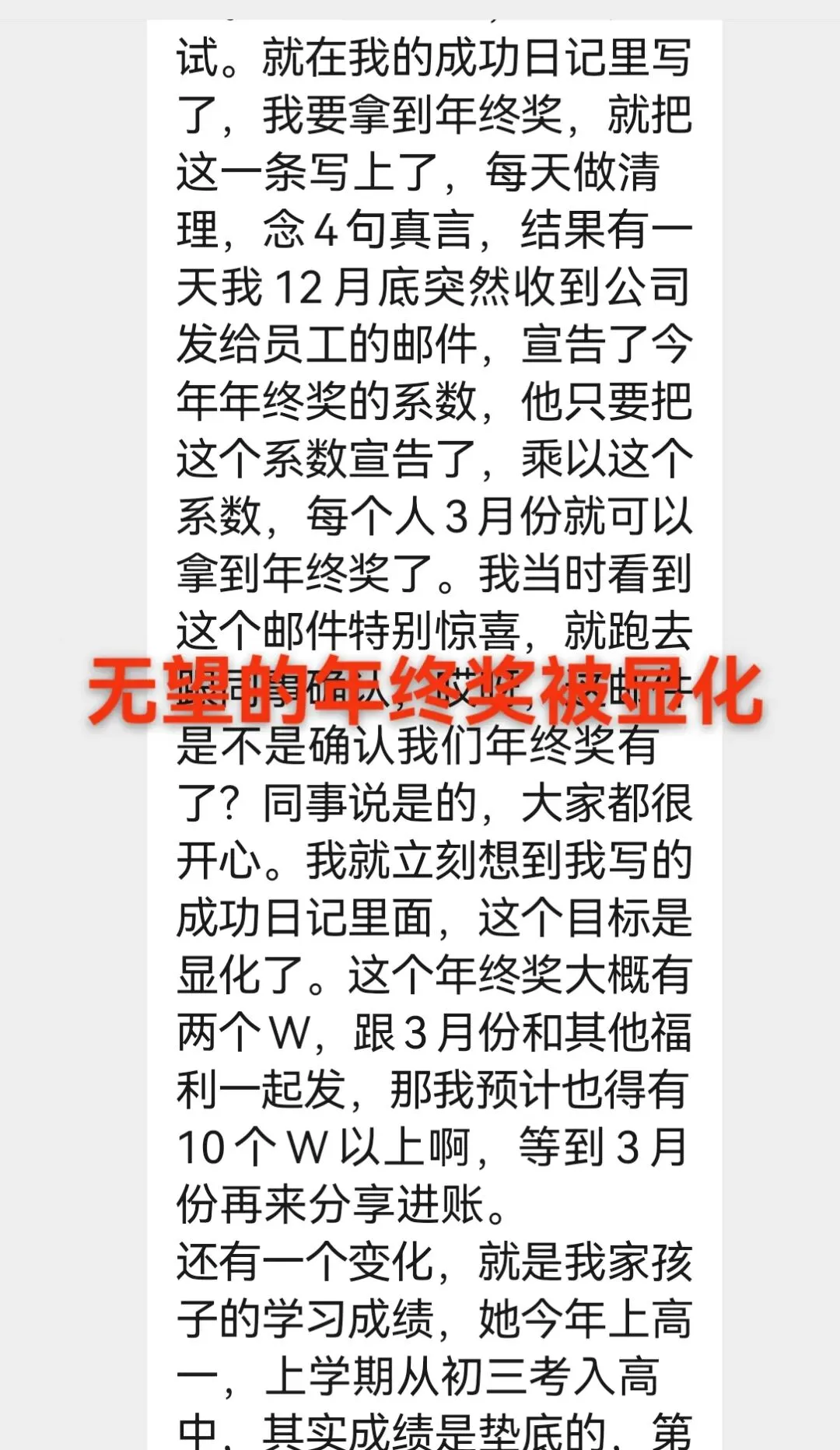 最终,奇迹真的发生了,她不仅收到了10w + 的年终奖的通知,还有额外的福利。这就是相信的力量!