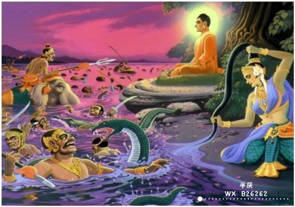 在fó教经典中,帕咩托拉尼并没有完整的世系或独立shén话,她并非fó教体系中的主要角色,却在fó教历史中留下了极为重要的一幕。她最关键的出现,发生在fó陀证悟之夜。当fó陀在菩提树下即将证悟无上正等正觉时,魔王波旬率军前来阻挠,并声称自己拥有大地的权利,fó陀无权在此修行。fó陀于是以手触地,援引自身累世功德,并召请帕咩托拉尼作为见证。随即大地震动,帕咩托拉尼显现shén体,她拧动发髻,将fó陀无量功德所化之水倾泻而下,水流如汪洋般冲散魔军,助fó陀最终证悟。这一情节成为“fó陀降魔印”造像的重要来源。