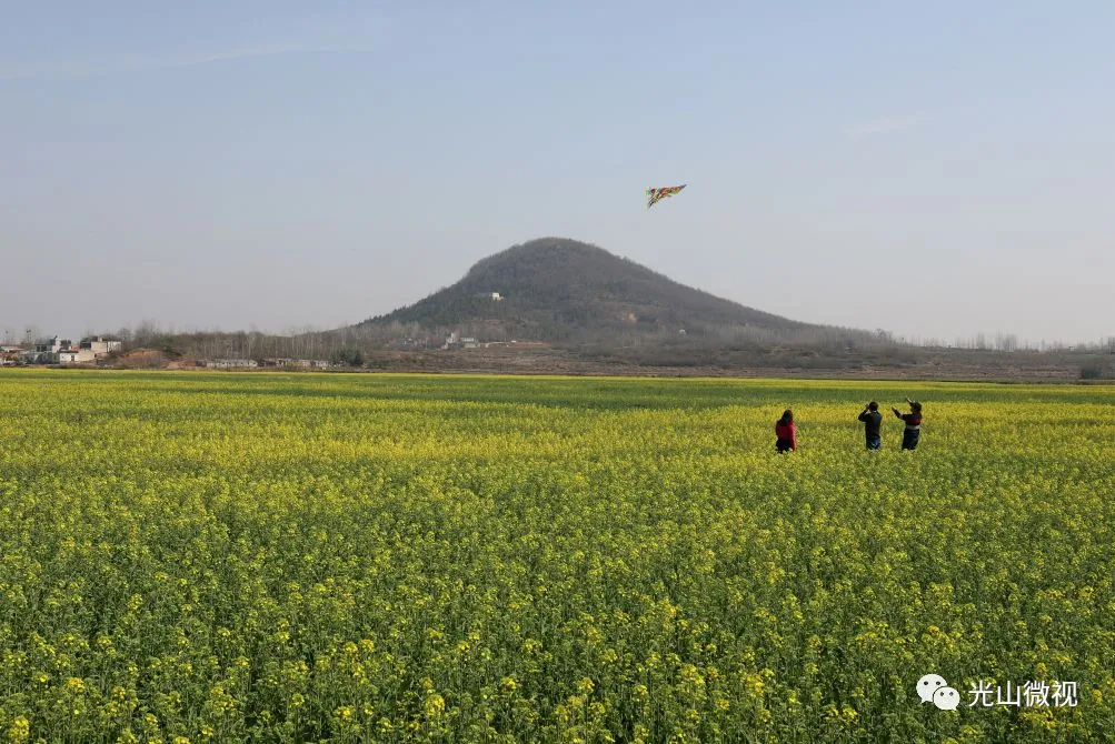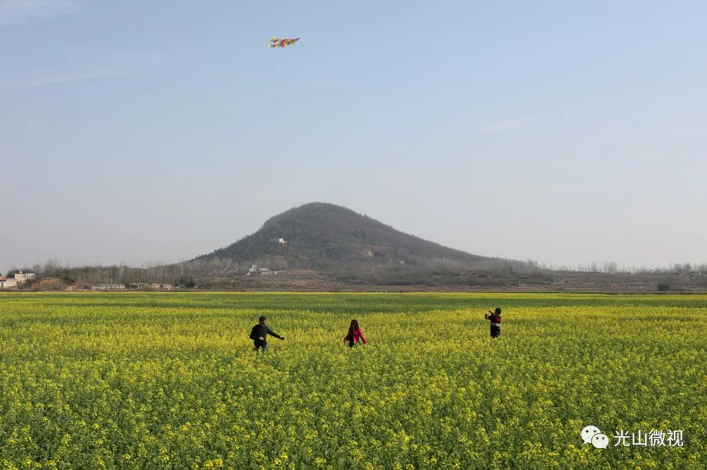 蓝天、独山和万亩油菜花田自上而下交相辉映,仿若一幅天然的油画。有踏春的游客带来了风筝,放线的在前猛跑,托风筝的在后紧随,在欢呼叫喊声中,一只美丽的风筝乘着油菜花丛飞上了蔚蓝的天空。