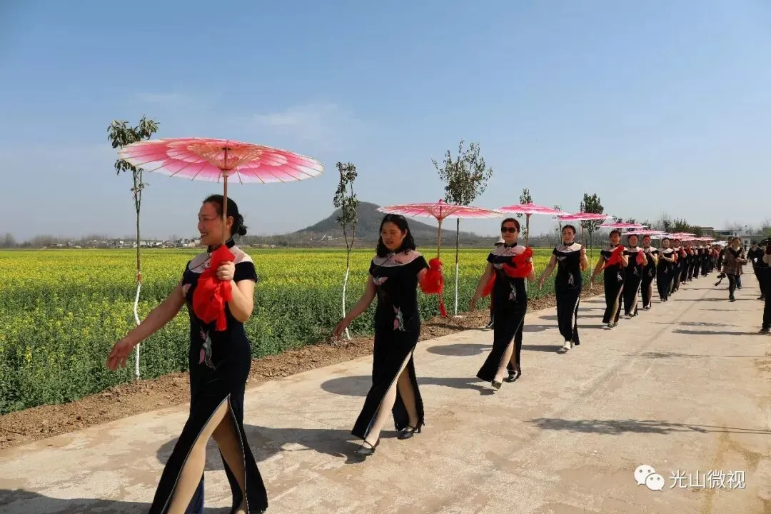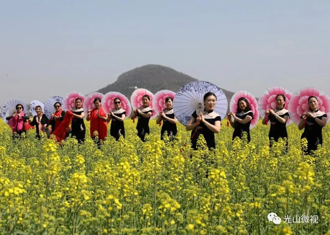 这边游人在放着风筝,那边音乐声渐渐入耳,一位位手持花伞,缓缓而来的模特,在音乐的配合下,踏着整齐的步子走在金黄色的花海中,原来们她们是光山县老干部艺术团的演员们。她们袅袅娜娜,摇曳生姿,宛如江南烟雨巷中走出的美景。花海美人引得过往游客纷纷驻足观赏,并把这难得的景象记录在了手机和相机里。