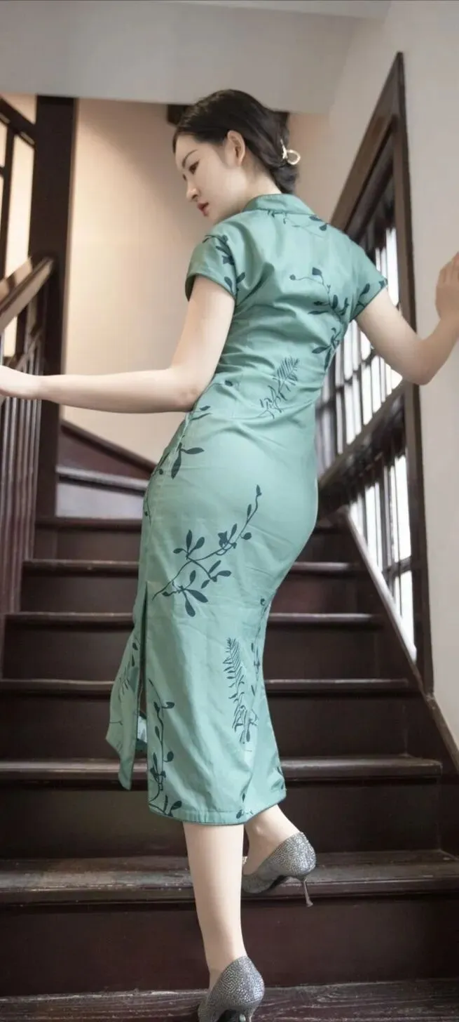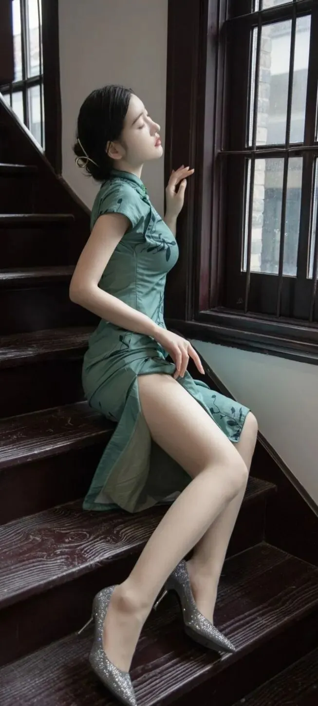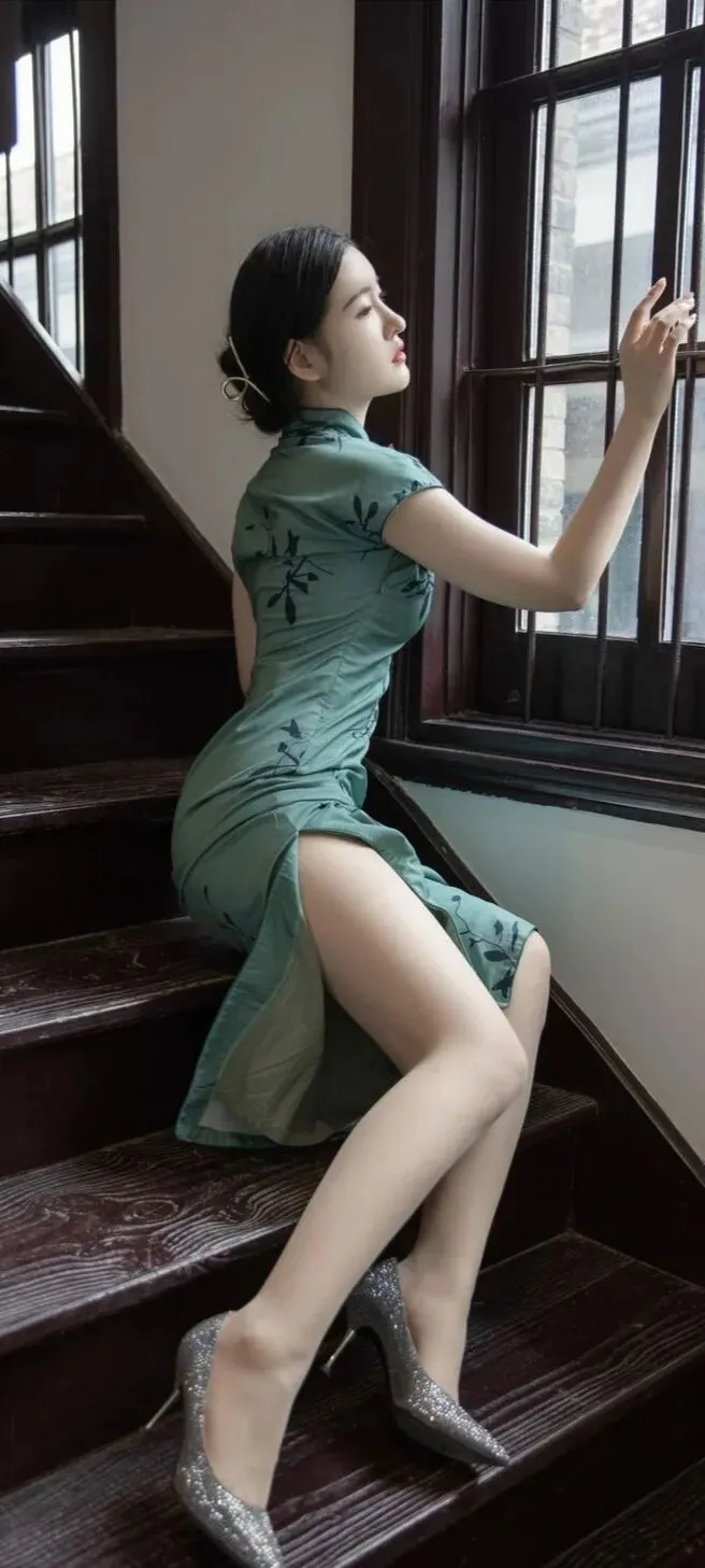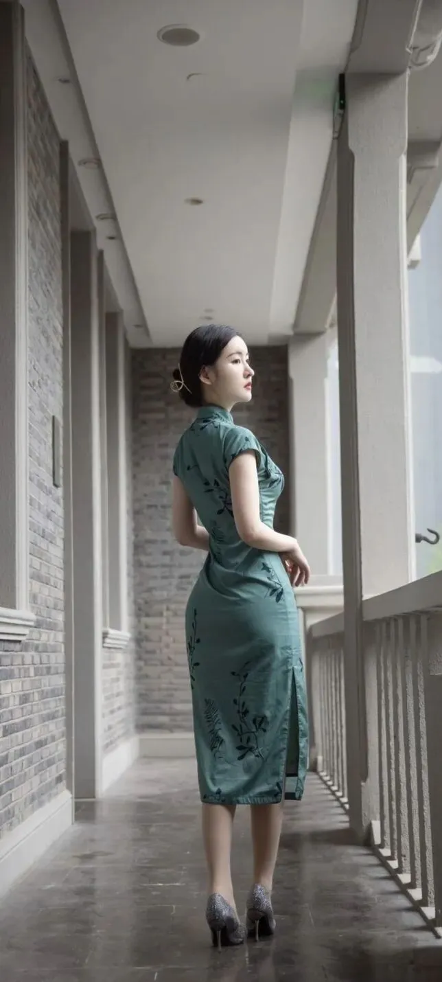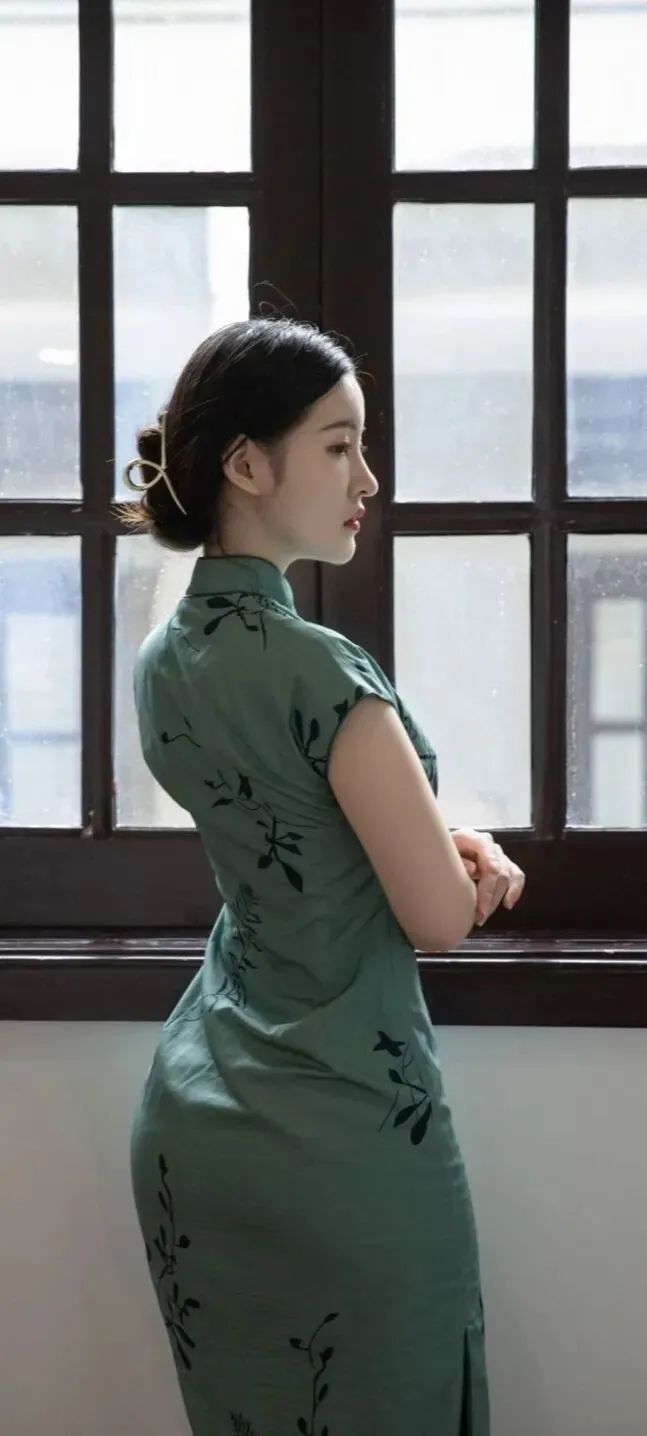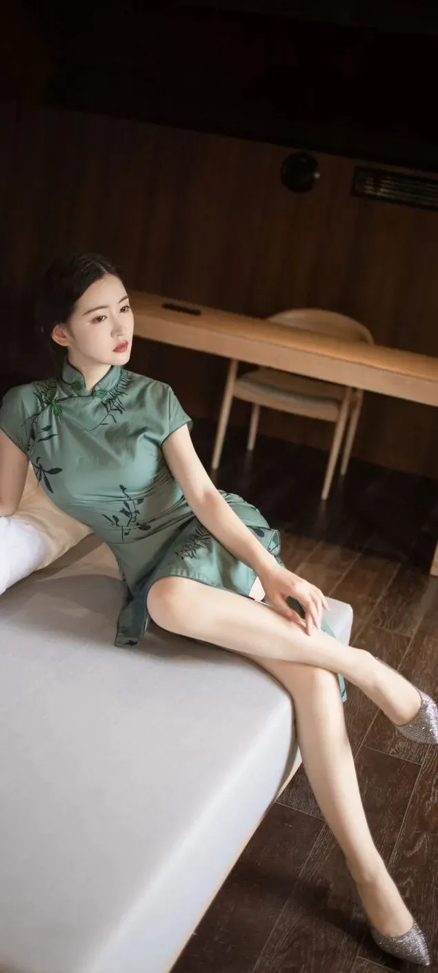 >美女模特沈梦瑶墨绿色韵味旗袍,诱人身材