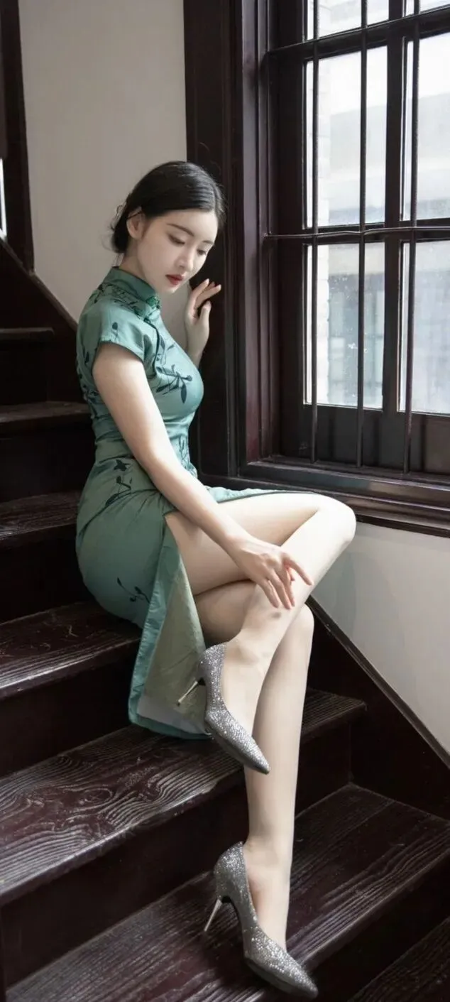 美女模特沈梦瑶墨绿色韵味旗袍,诱人身材