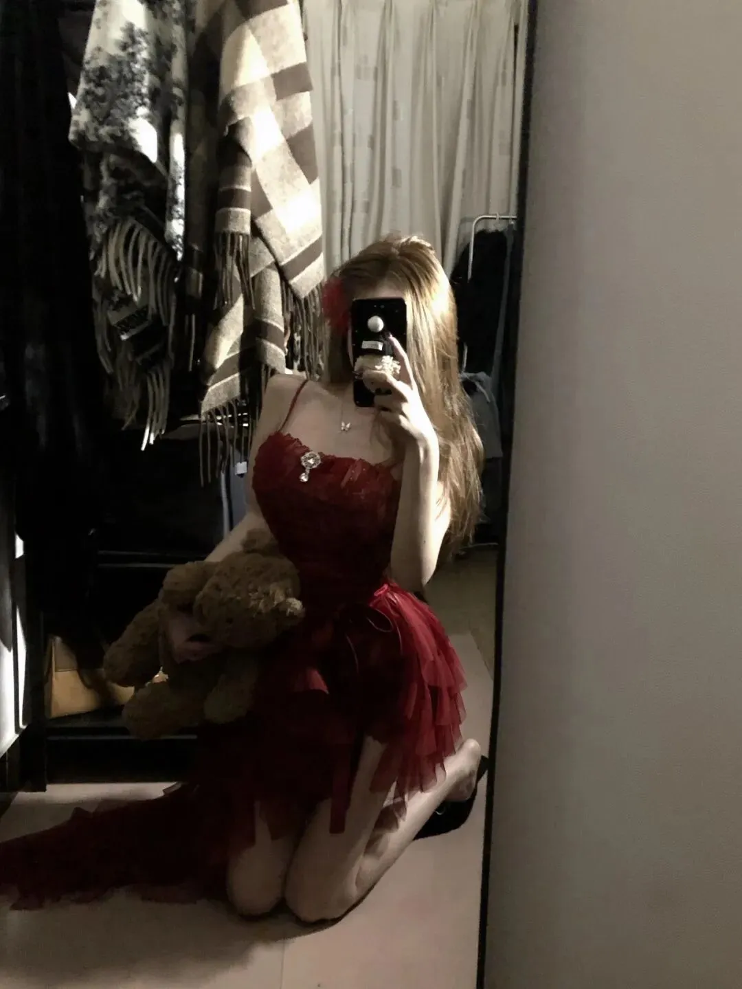 镜前跪姿,双手自然垂落,持手机挡脸,身体微微放松。红色蕾丝吊带裙修身显曲线,拖尾设计强化氛围感,高跟鞋提升气场,小熊玩偶增加甜妹感。垂臂姿势避免手部悬空,昏暗光线渲染纯欲氛围,氛围感直接拉满。