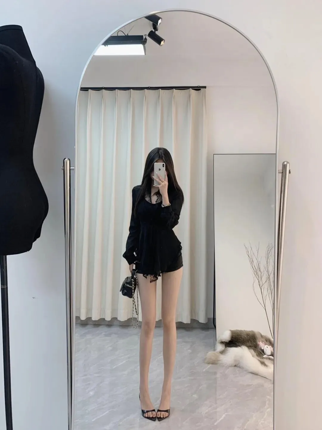 镜面拎包站姿,一手挡脸、身体微微放松。黑色蕾丝领衬衫 + 黑色短裤 + 肤色丝袜 + 黑色细跟凉鞋 + 菱格包强化纯欲辣妹感,蕾丝领增加精致细节,短裤拉长腿部线条。镜面纵深感显高显瘦,拎包动作避免手部悬空,氛围感直接拉满。