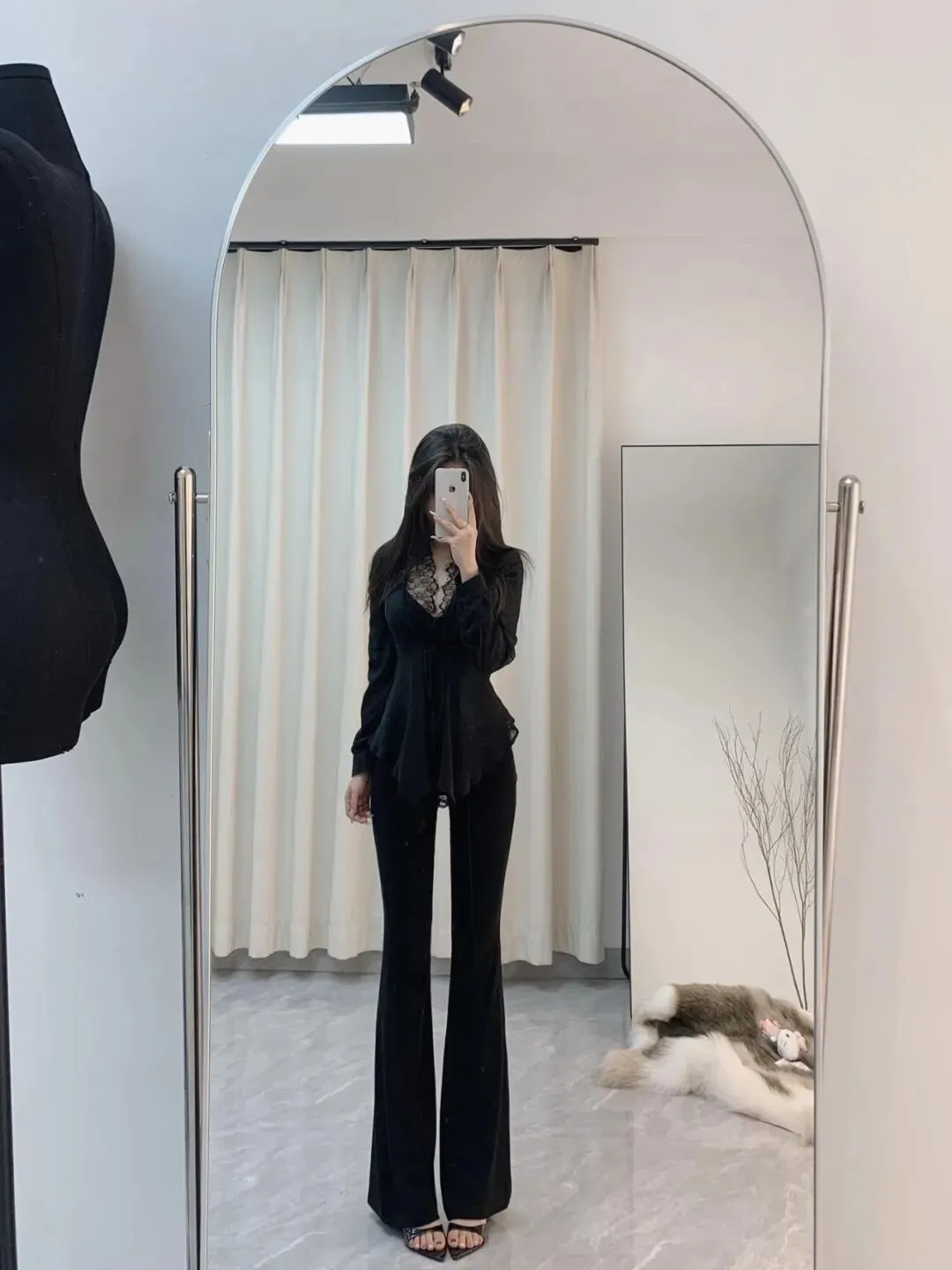 镜面垂臂站姿,一手垂落、一手挡脸,身体微微放松。衬衫的慵懒感与阔腿裤的垂坠感融合,细跟鞋显腿长,全黑穿搭增加通勤氛围。垂臂姿势避免手部悬空,镜面纵深感显高显瘦,日常通勤气质拉满。