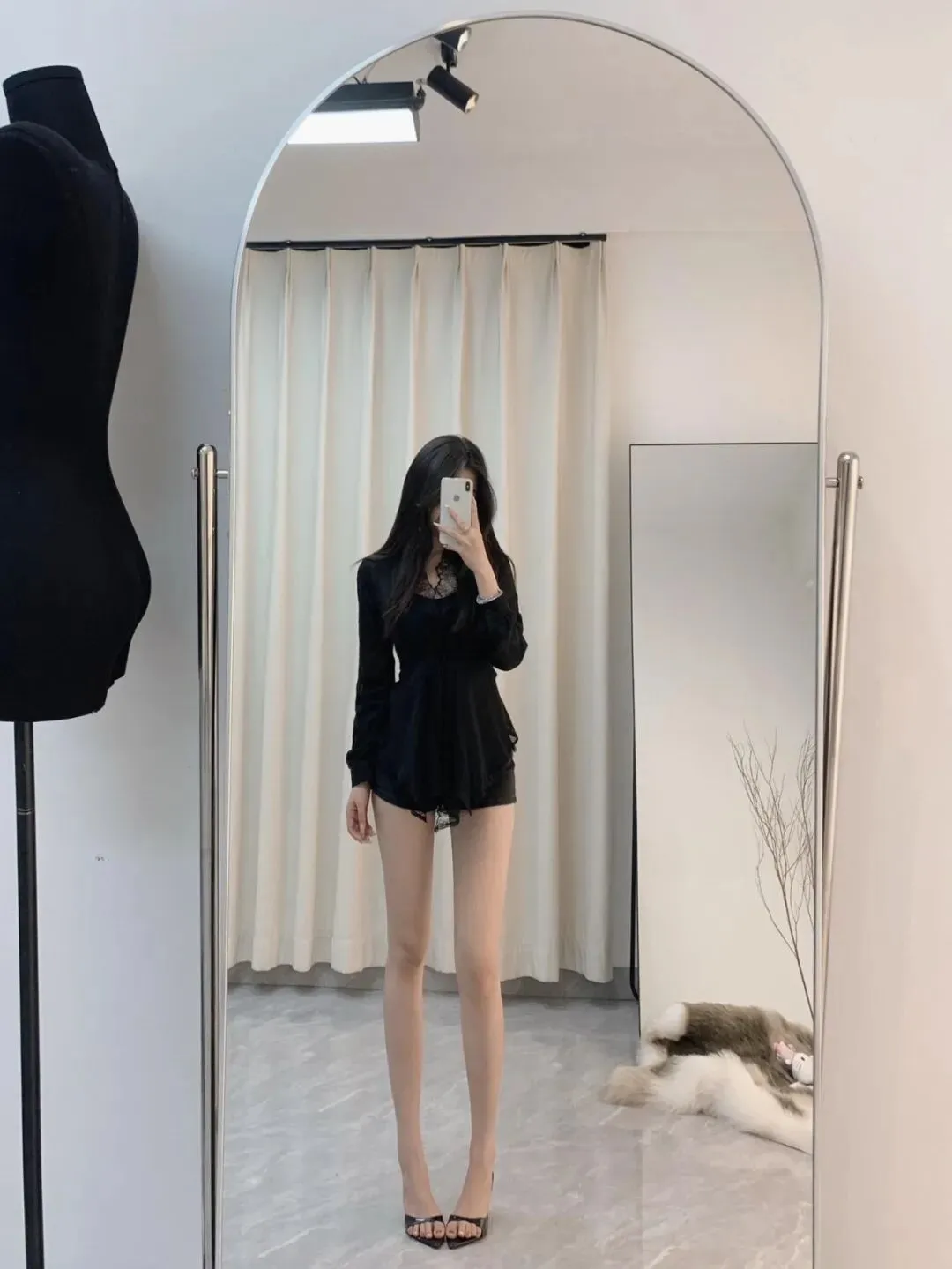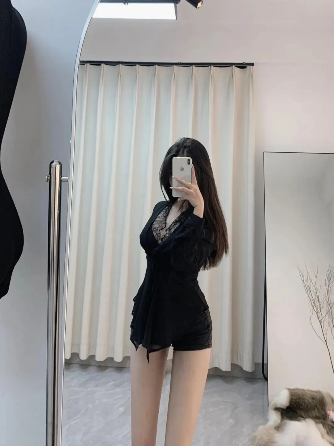 镜面正面站姿,一手垂落、一手挡脸,身体微微放松。衬衫的蕾丝领与丝袜的通透感平衡,短裤显比例,窗帘背景突出穿搭亮点。垂臂动作避免手部悬空,镜面纵深感最大化显高显瘦,辣妹出片氛围感拉满。