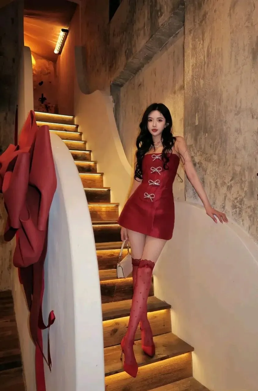 真正的点睛之笔,在于下装的搭配。 她没有选择常见的露腿或黑丝,而是大胆搭配了红色蕾丝过膝长袜。这一选择堪称绝妙:蕾丝花纹带来了若隐若现的肌肤视感和极致女人味,而过膝的长度与短裙之间形成的“绝对领域”,则极大拉长了腿部线条,让性感更具层次和神秘感。脚下一双同色系高跟鞋,从色彩上无限延展了腿长,完成了造型在纵向的利落收尾。