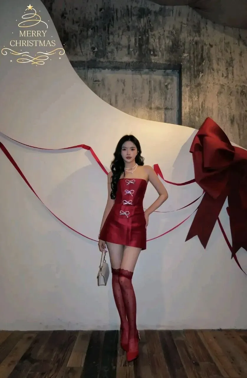 核心战袍,是一件设计感十足的红色抹胸短裙。 浓郁的圣诞红本身就已极具节日感染力和视觉冲击力,而胸前的银色蝴蝶结装饰则是神来之笔——它不仅巧妙提升了视觉重心,其闪耀的质感与立体的造型,更在热烈中注入了精致与甜美的气息,避免了纯色抹胸的单调,成为上身当之无愧的亮点。抹胸设计大方展露优越的肩颈线与锁骨,将性感定格在优雅的范畴。