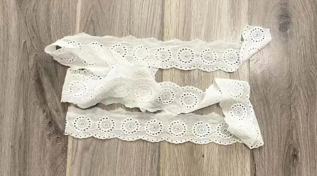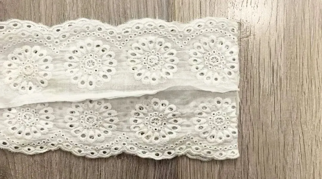 1.两条蕾丝正面对正面车缝,修剪掉多余的布料;