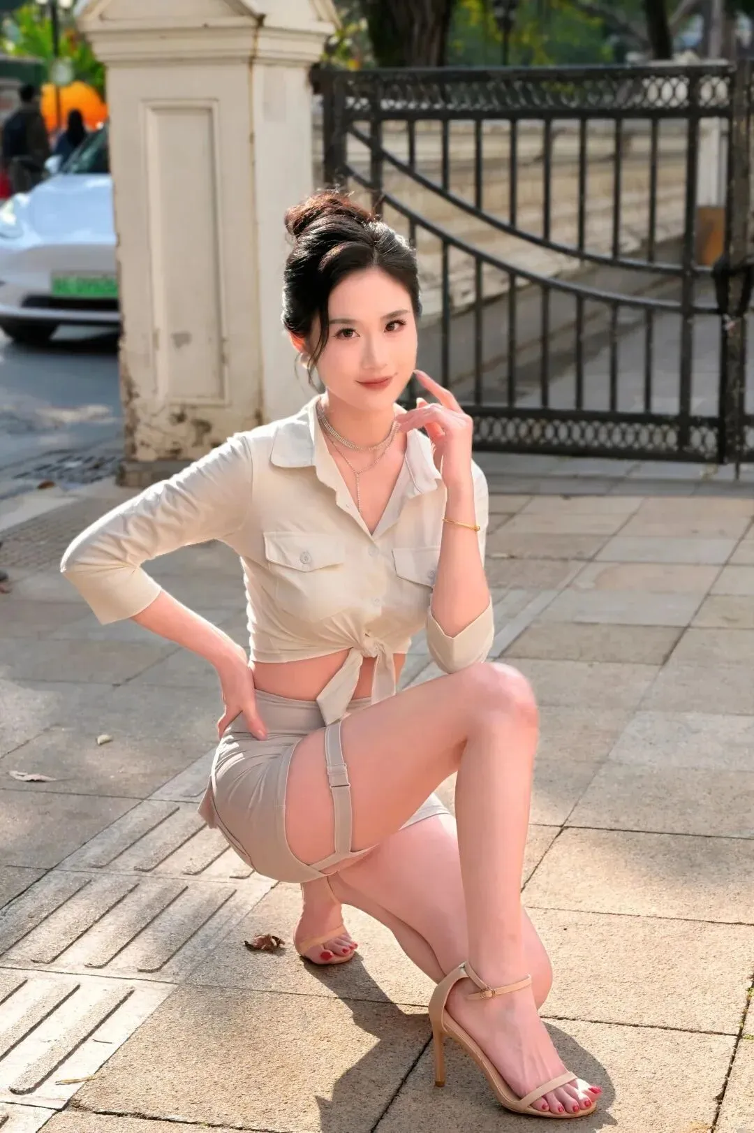 纯白色的衬衣干净又清爽,面料挺括有型,不会软塌塌贴在身上,哪怕出汗也不会显邋遢,领口解开两颗扣子,悄悄露出精致的锁骨,温柔中带着一丝小性感,分寸感拿捏得死死的。 搭配的米色紧身短裤,和白色衬衣完美呼应,温柔的米色调中和了衬衣的利落,多了几分柔和,整体穿搭和谐又高级。短裤也是紧身版型,贴合腿部线条,悄悄修饰腿型,让双腿看起来又直又细,圆润却不臃肿,长度刚刚好,露出笔直纤细的小腿,利落又清爽,走在沙面的石板路上,步伐都透着从容与自信。