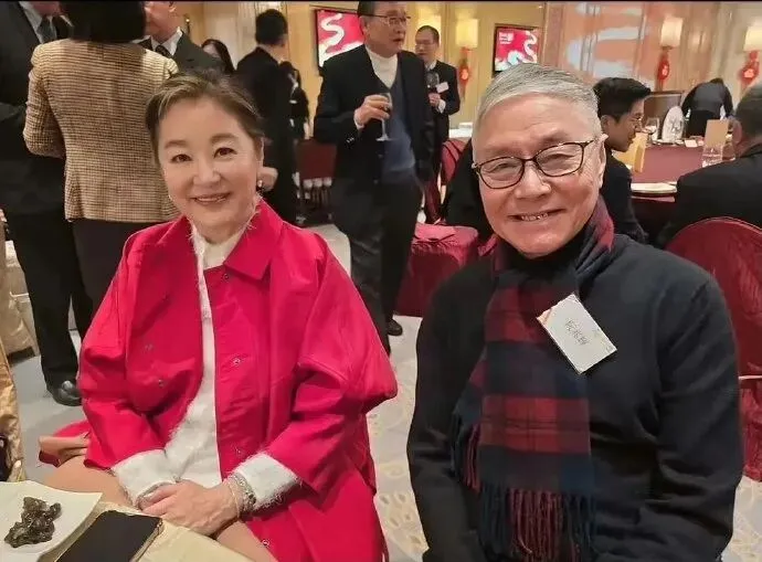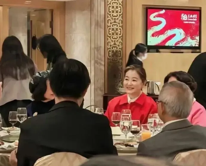 在香港参加某个晚宴时,和朋友在一起。一身玫红色外套,笑容满面,气色很好。
