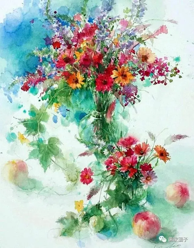 看她笔下的玻璃瓶或碗多么通透,花朵氤氲的气氛多么恰到好处。与一般水彩技能专注于写实不同,永山裕子的水彩作品达到一种写实与写意的平衡。其笔下有生命力的花朵和绚烂奔放的背景达到一种意蕴缭绕的境界。而且我认为她无论写实还是写意都是顶尖级的。