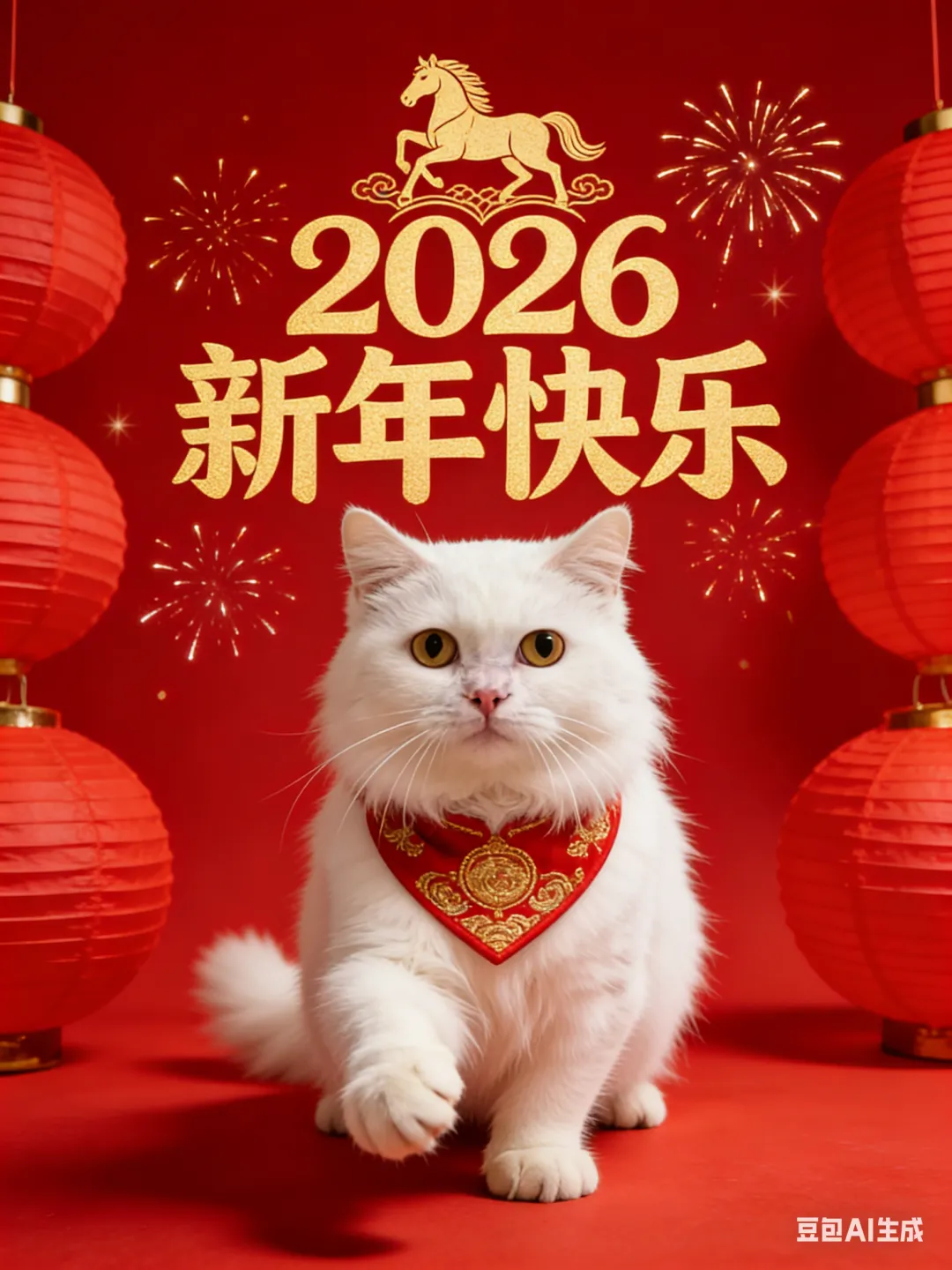 装饰:佩戴红色新年时尚小围脖(红金配色),凸显新年氛围与萌趣时尚感 神态:跟参考图一样 背景场景:背景为大红色,上方有金色的 “2026 新年快乐” 字样且带有马的图案,两侧布置红色灯笼,空中点缀烟花,营造浓厚新年氛围