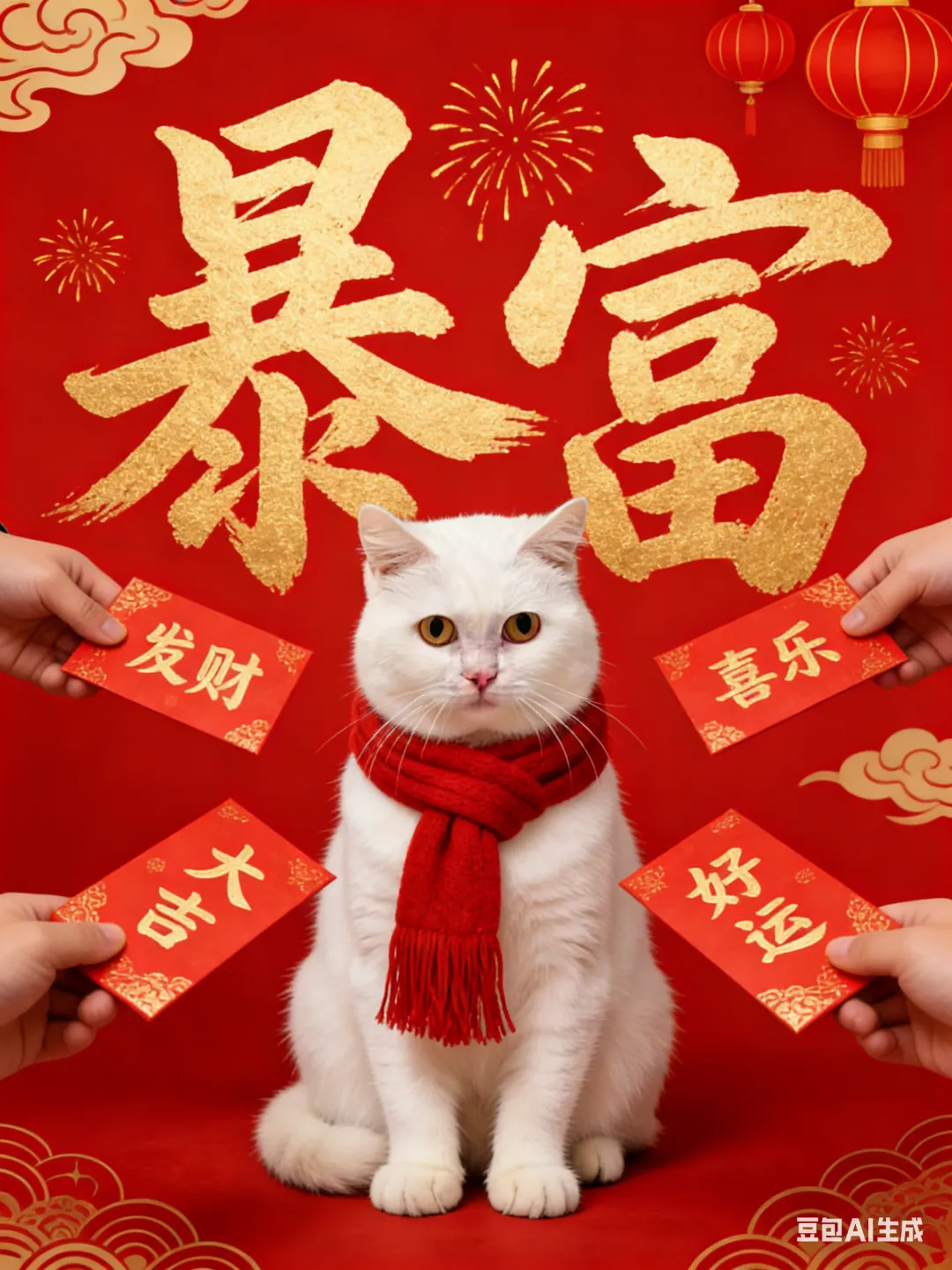 背景场景:背景为大面积喜庆正红色,有巨大金色书法字体 “暴富”,点缀金色烟花、红色灯笼、祥云纹样,营造浓烈春节氛围