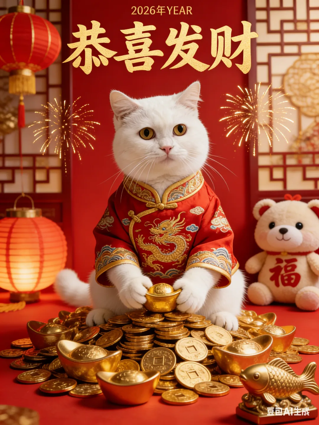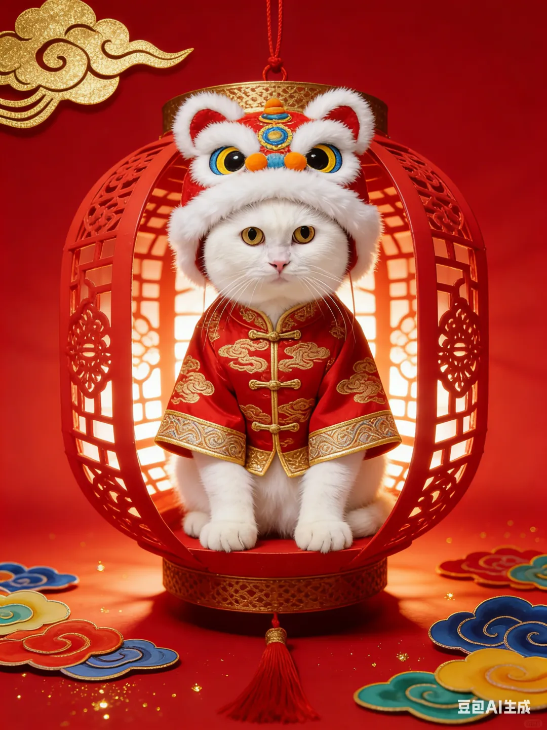 设定:宠物作为主体,全身入镜,着重展现帽子、服饰及灯笼的细节 发型:头戴醒狮造型帽子,帽子主体红色,带白色毛绒边饰,醒狮眼部、额头有蓝、黄、橙等彩色装饰 服饰:身着红色中式传统服饰,绣有金色祥云花纹,衣摆、袖口金色刺绣滚边,盘扣设计 背景场景:背景为浓郁红色,左上角有金色祥云剪纸,下方和两侧分布彩色祥云剪纸,散布细小金色闪光颗粒 动作姿态:宠物端坐在红色镂空雕花灯笼内,灯笼顶部有红绳,底部有流苏,宠物姿态端庄 拍摄参数:以高清画质呈现,注重光线透过灯笼镂空处营造的通透层次感,展现服饰、帽子、灯笼及背景装饰细节 滤镜风格:增强红色背景的喜庆感,突出金色装饰的鎏金质感,保留彩色剪纸的丰富色彩,营造华丽且喜庆的视觉效果 ,比例 「3:4」恭喜发财猫