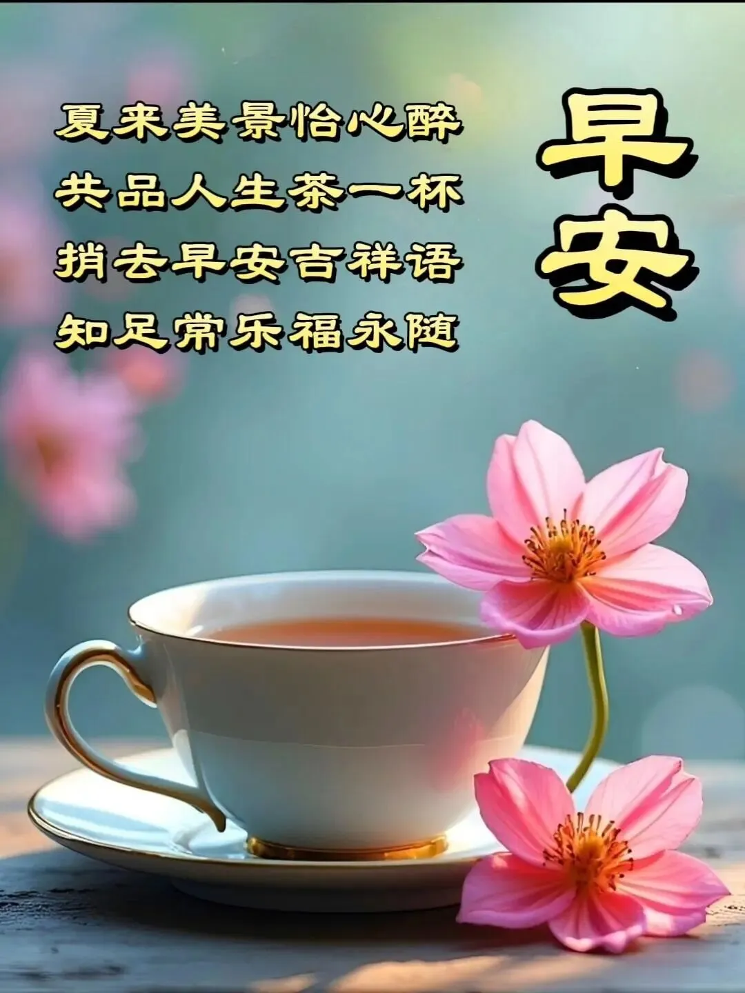 和睦家庭无价宝,心态乐观永不倒;一切看开无烦恼,活得自在又逍遥;岁月匆匆情长留,诸多关怀在心头!愿温馨的问候,为您带来一天的好心情!岁月静好,夏日早安!🌹❤️🙂🤝🌺🎉