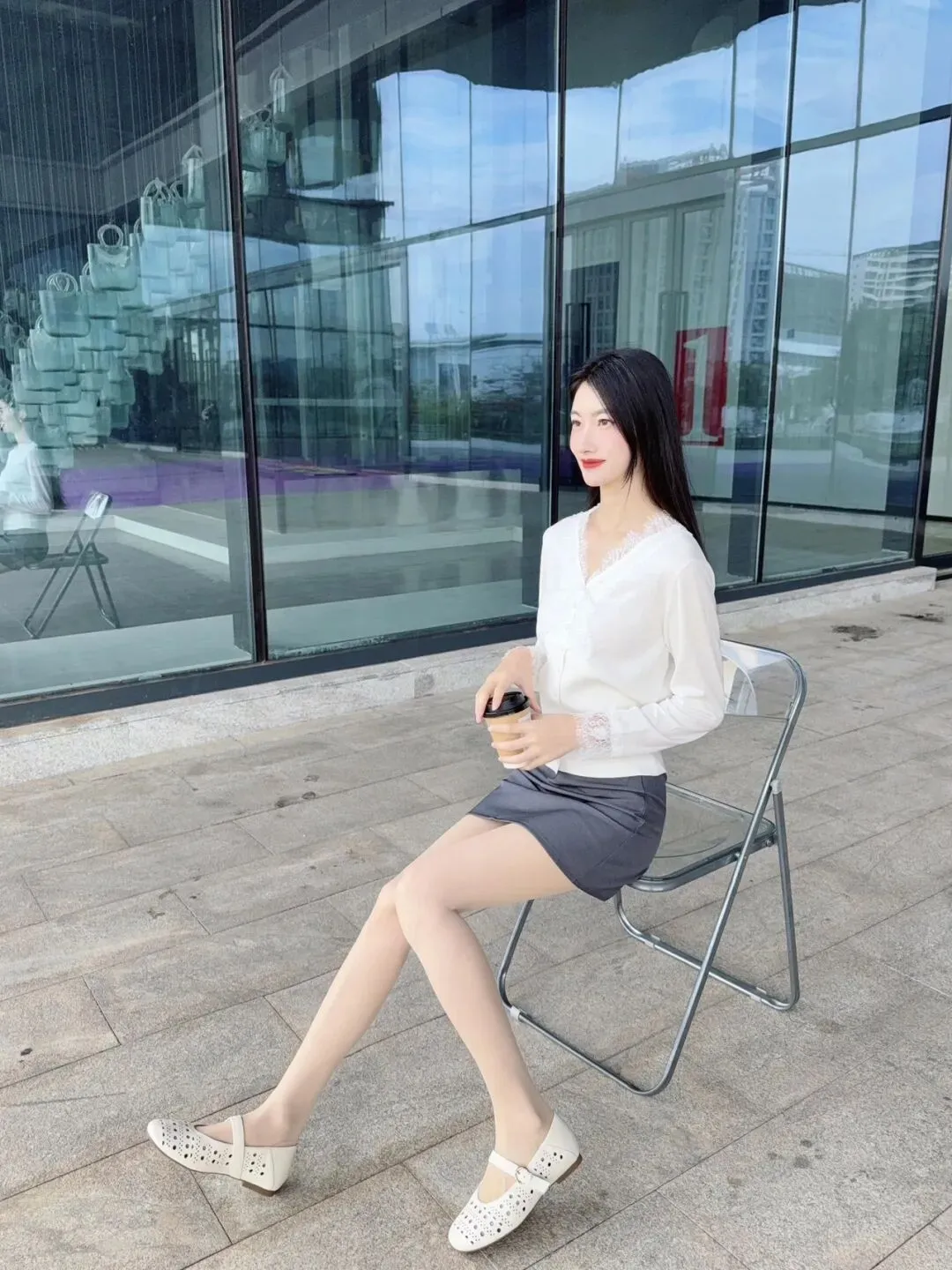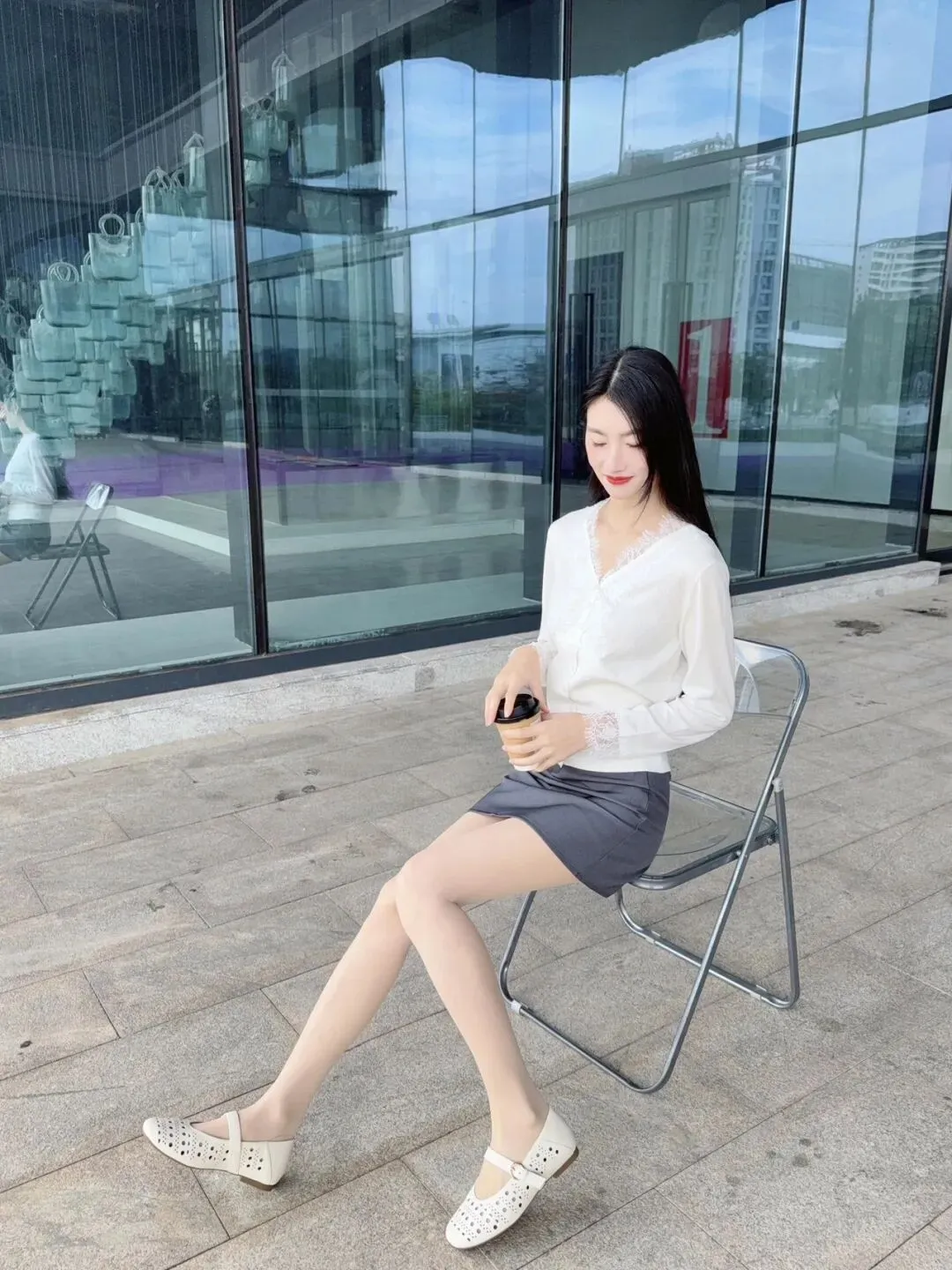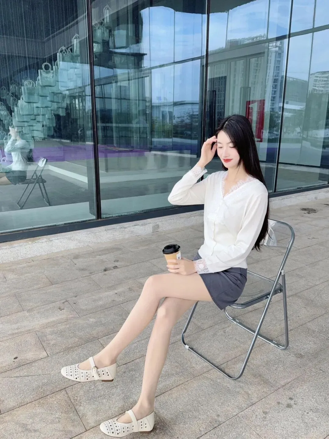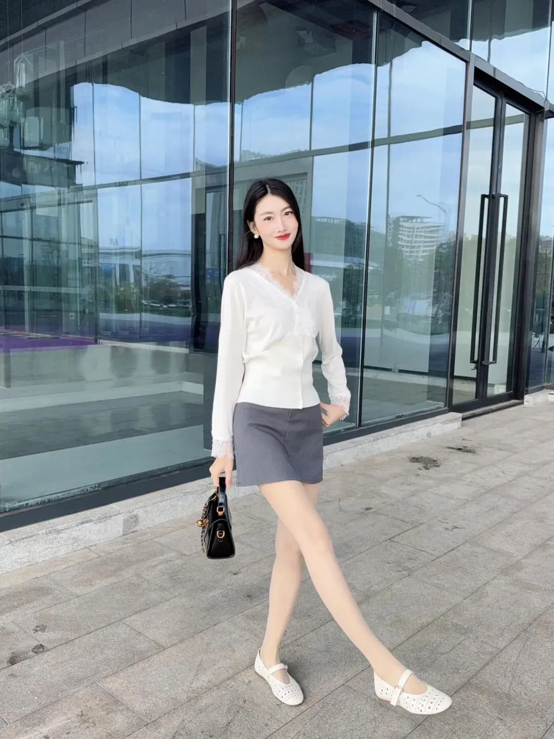 拉夏贝尔的白色蕾丝V领长袖T恤,凭借精致蕾丝与优雅V领设计,自带清新甜美又温柔的气质。当它与灰色短裙、肉色丝袜和白色单鞋搭配在一起,能营造出一种简约而不失精致、甜美又充满青春活力的日常造型,非常适合多种日常场合。