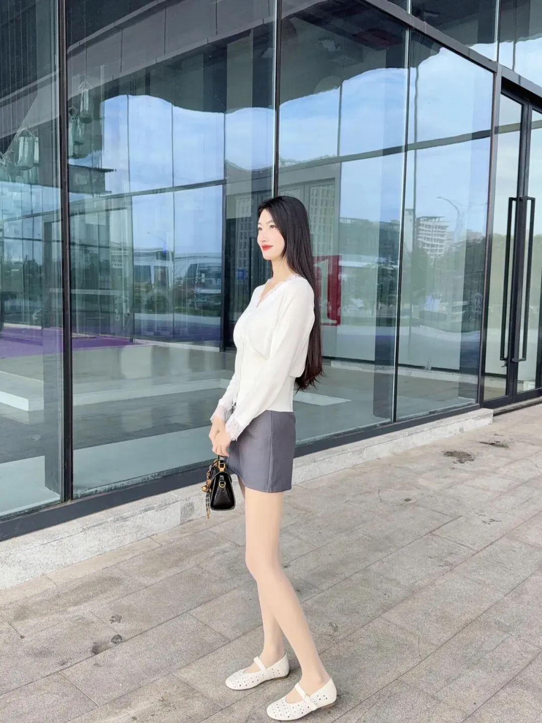 肉色丝袜能够与腿部肤色自然融合,遮盖腿部的小瑕疵,如鸡皮、疤痕等,让腿部看起来更加光滑、细腻、均匀。同时,它还能起到一定的保暖作用,适合在春秋季节穿着。在与白色蕾丝T恤和灰色短裙搭配时,肉色丝袜能够使整体造型更加完整,避免腿部与裙子之间出现色彩断层。