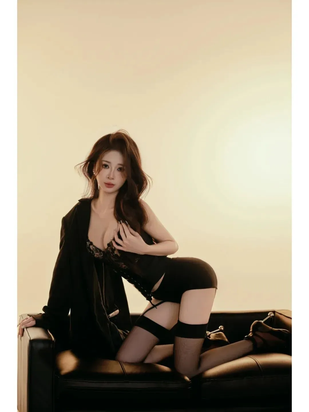 黑色西装内搭蕾丝束腰,配上薄黑长筒袜,勾勒绝美腰臀比!透视设计直接添了随性媚感,往皮质沙发一靠,纯欲氛围感直接拉满~