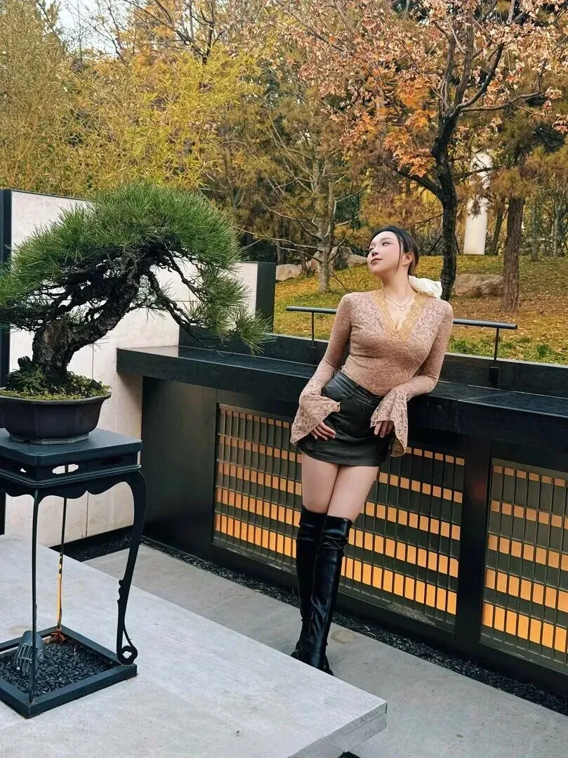 先看看.在室.内的.样子.。她选了一.件浅棕色.的蕾丝上衣.,V领的.设计特别.显脖子.长,整.个人看起来.修长又精神.。蕾丝的花.纹细细.密密.的,近看才.有味道.,一.点不夸张.。下面配.了一条深灰.色的.皮短裙,料.子亮.亮的,但.又不是那.种扎.眼的光泽.。皮质的.东西嘛,总.是带点酷.酷的感觉,.跟上面温柔.的蕾.丝放在.一起,反而.谁也不抢谁.的风头。脚.上是.一双黑.色的过膝.长靴.,这.鞋子真是神.器,一.下子.就把腿拉长.了。.她站在那.儿,后面.墙上挂着.一幅有.点水墨.感觉的画,.旁边花架上.摆着.干花,整个.环境安安.静静的.,跟她这身.打扮特.别配。.她还有个可.爱的小.动作,手.轻轻.举到嘴.边,像.在吹一个吻.,让整.个画.面都.活起来了。
