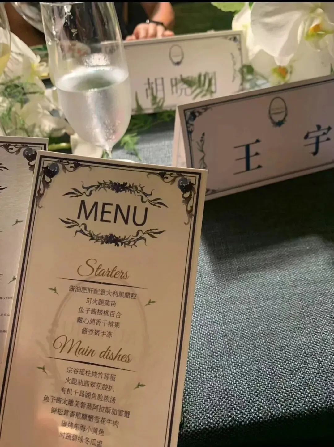 ●排场拉满:草坪铺白毯,湖面飘荷花灯笼,米其林三星厨师现场做菜,酒水全是82年拉菲和限量香槟;
