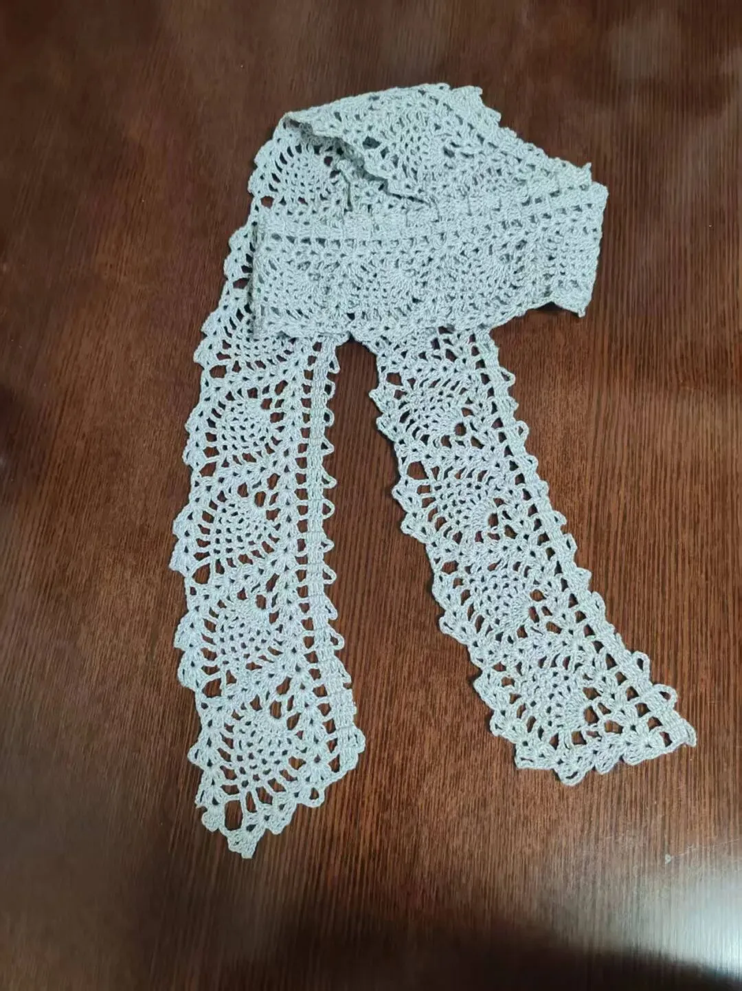 这条用菠萝花配上长条带子拼接的围巾既可以继续加宽,也可以就此收尾,这是传统方法无可比拟的。