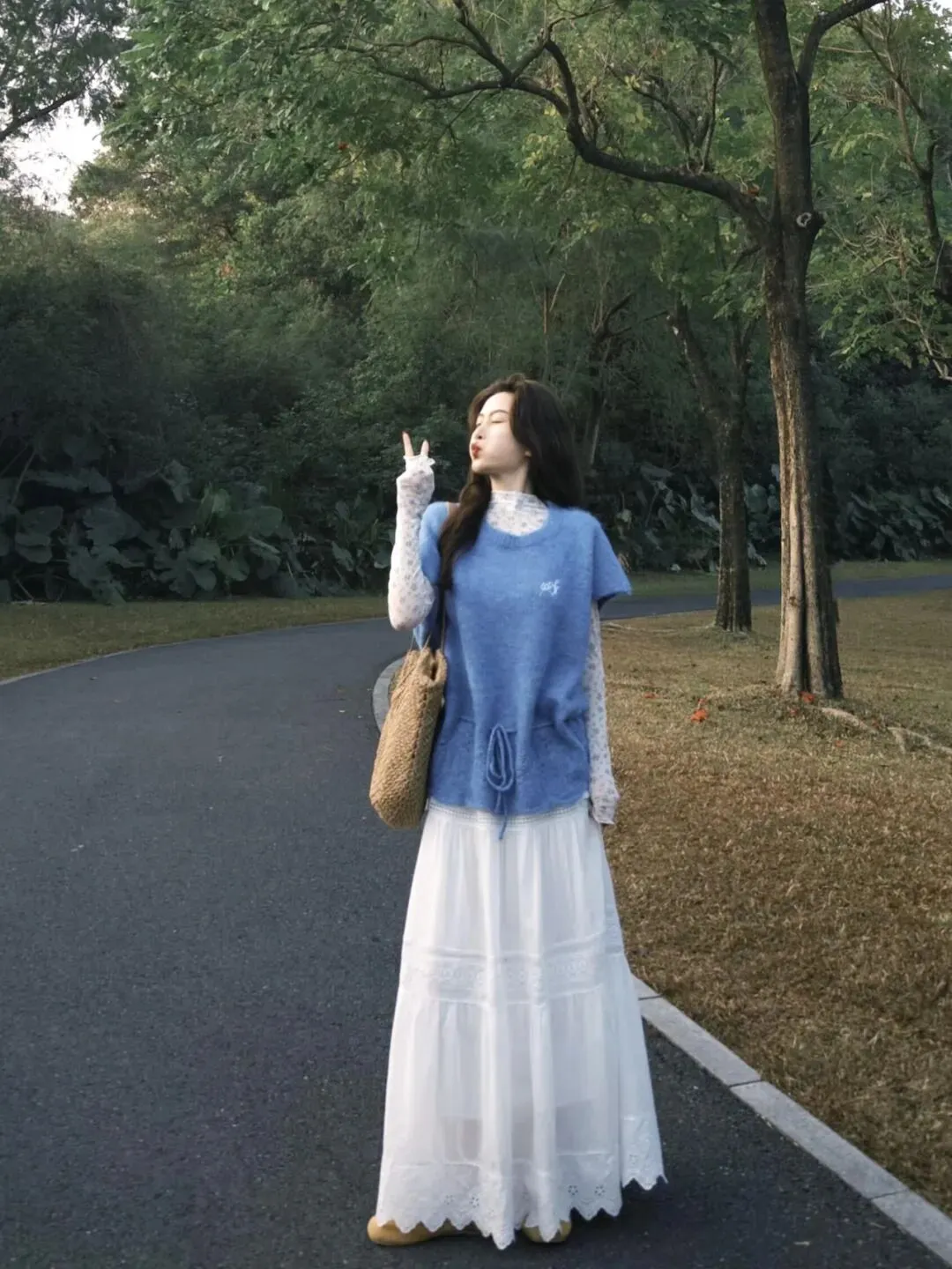 这件克莱因蓝针织马甲色彩鲜亮,抽绳设计增添了松弛感。内搭蕾丝打底衫,露出精致的花边袖口,温柔又有层次。下身搭配白色蕾丝长裙,垂坠感十足的裙摆自带仙气,再配上草编包与浅黄单鞋,整套穿搭清新又治愈,是秋冬户外出行的温柔氛围感首选。