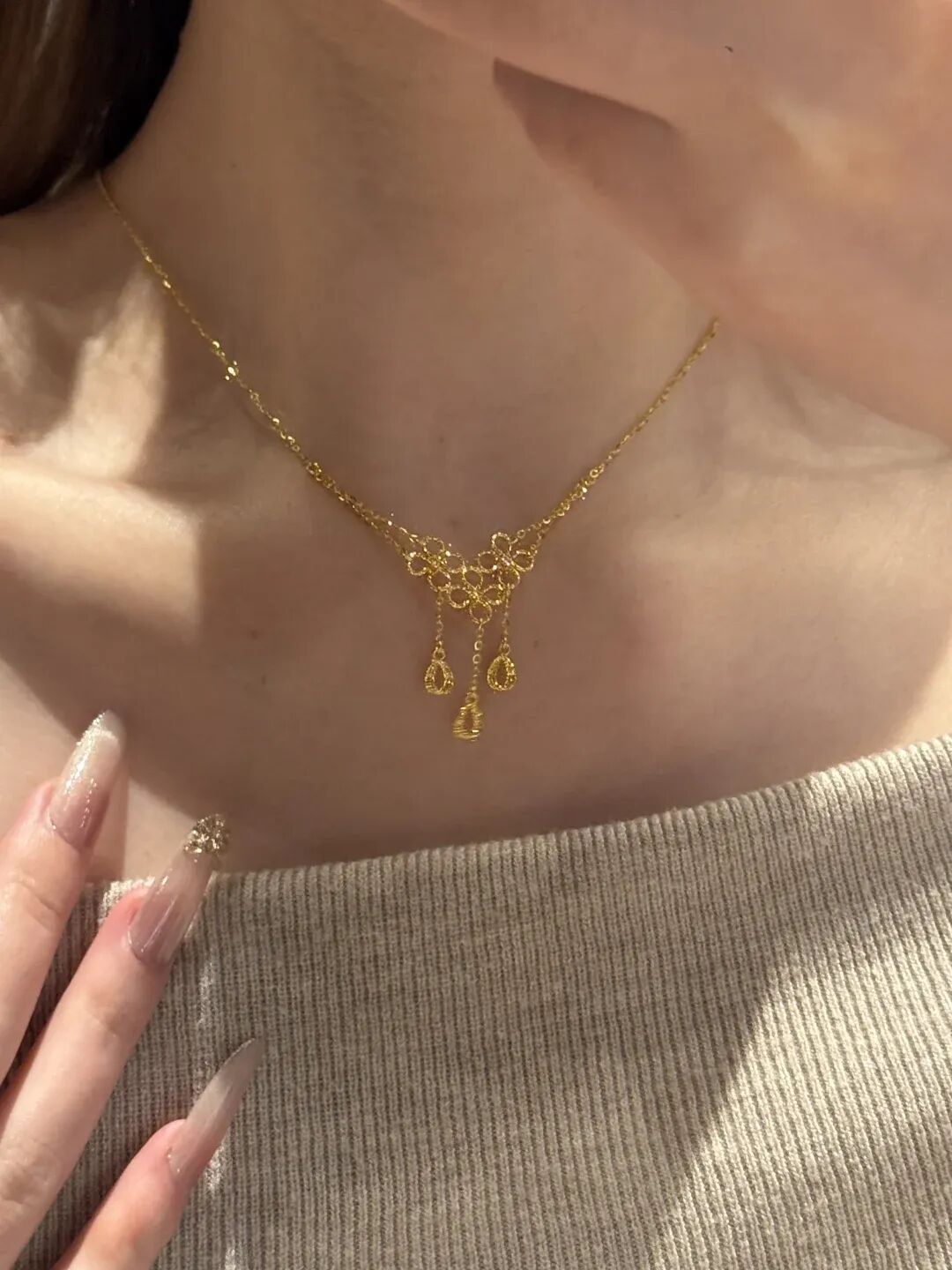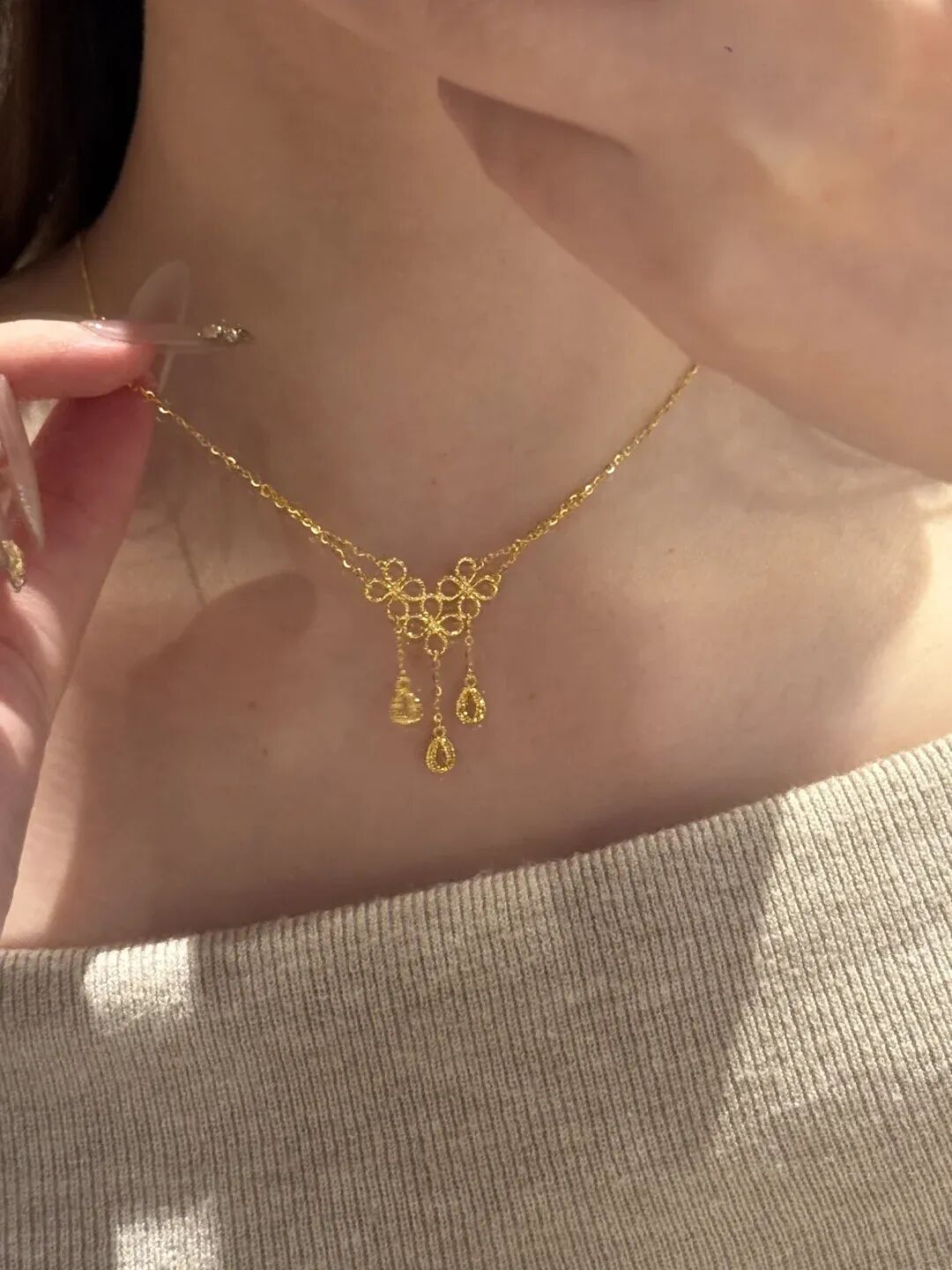你看这链子多细,那个小蕾丝花纹多精致。戴这种项链,给人的感觉就不是那种“家里有矿”的土豪感,而是一种**“富家千金”的温柔感**。不像那种大粗链子挂脖子上生怕别人不知道你有钱。这种款戴着就是显白、显锁骨,稍微动一下,那个小水滴就在那儿晃,看着特别灵动,一点都不老气。