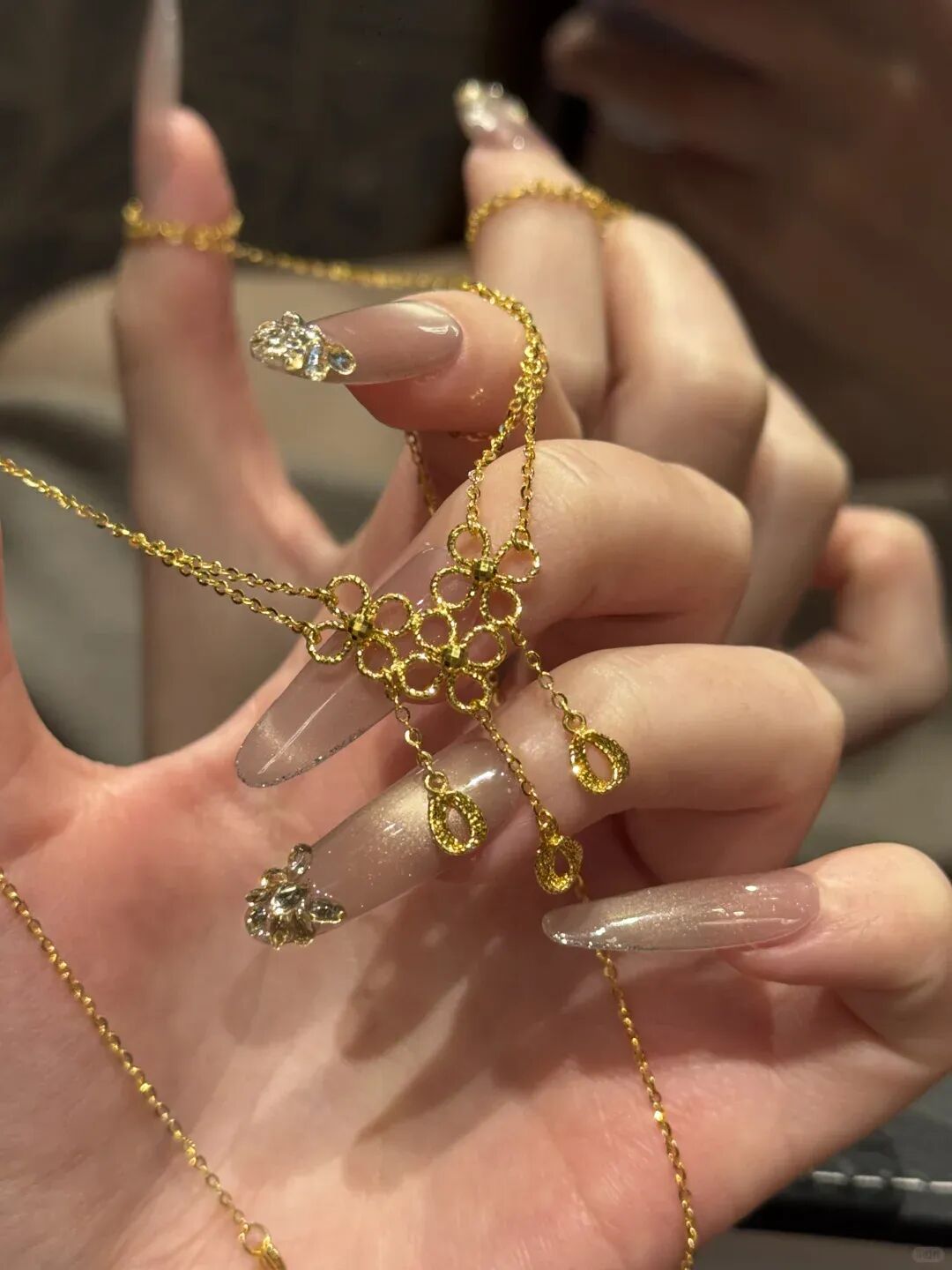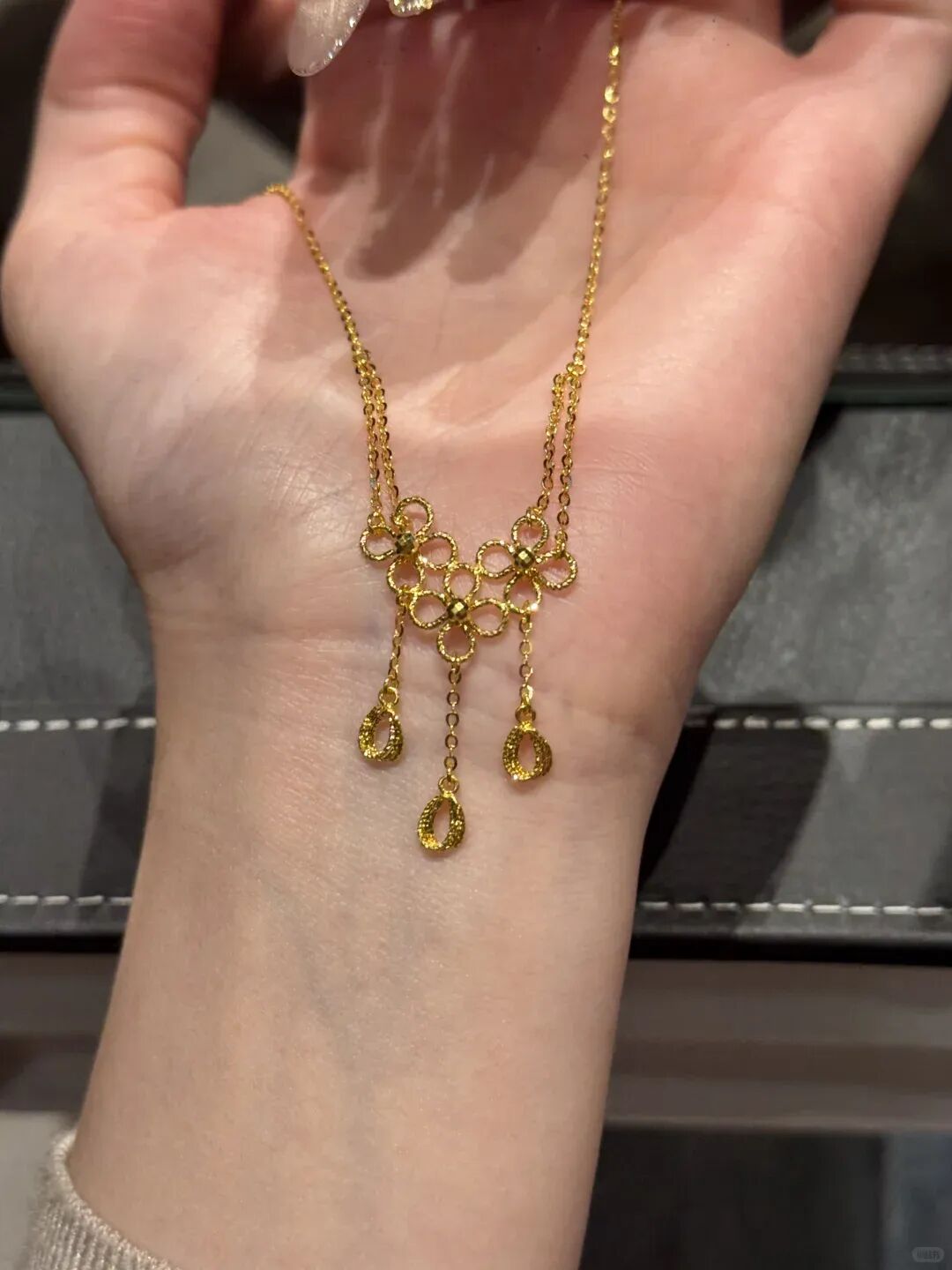 你想啊,这种带花丝、带流苏的款式,工费贵得要死!普通人买金子,恨不得一分钱工费不加,光算克重,觉得工费贵了就是亏了。但戴这种项链的人不一样,人家心里门儿清:姐买的是开心,是设计。 哪怕这工费都能再买个小金珠子了,人家也不心疼。这就是段位,不光图保值,更图戴出去漂亮。