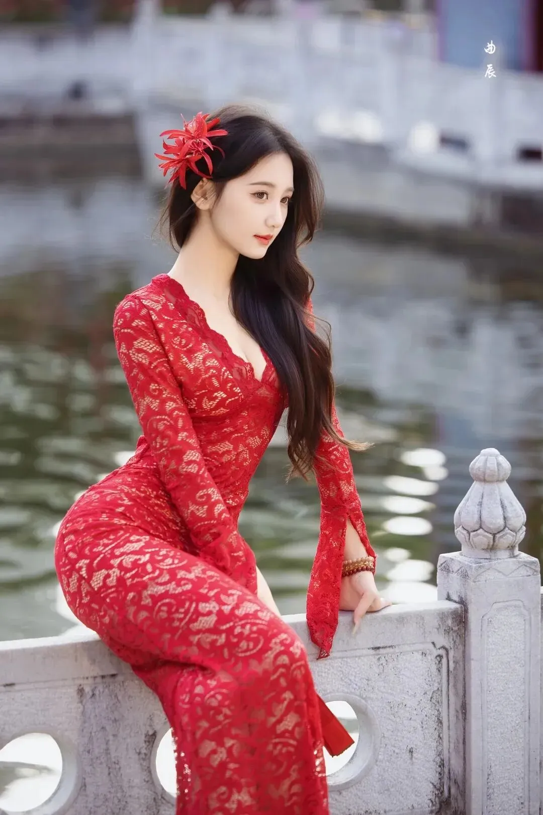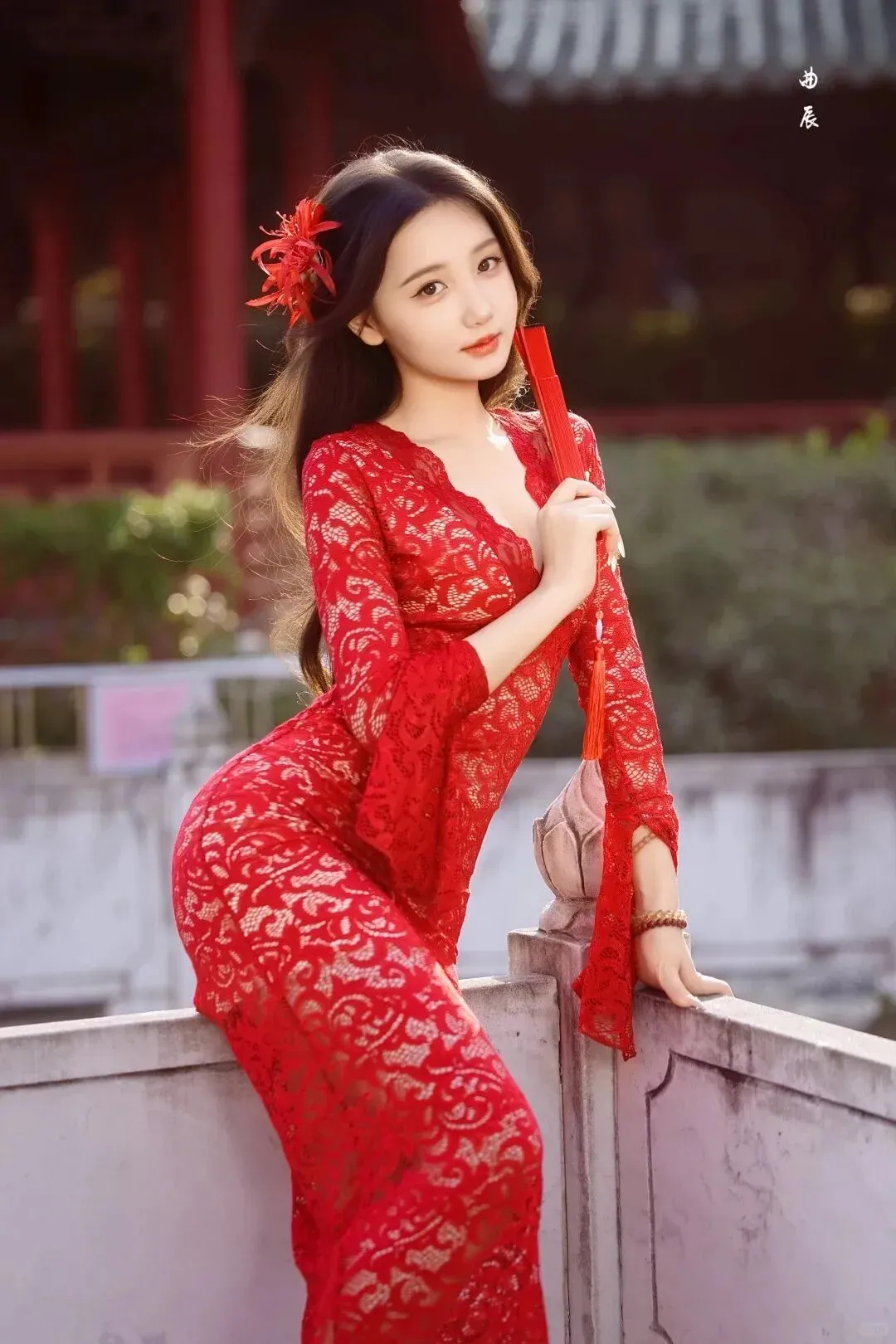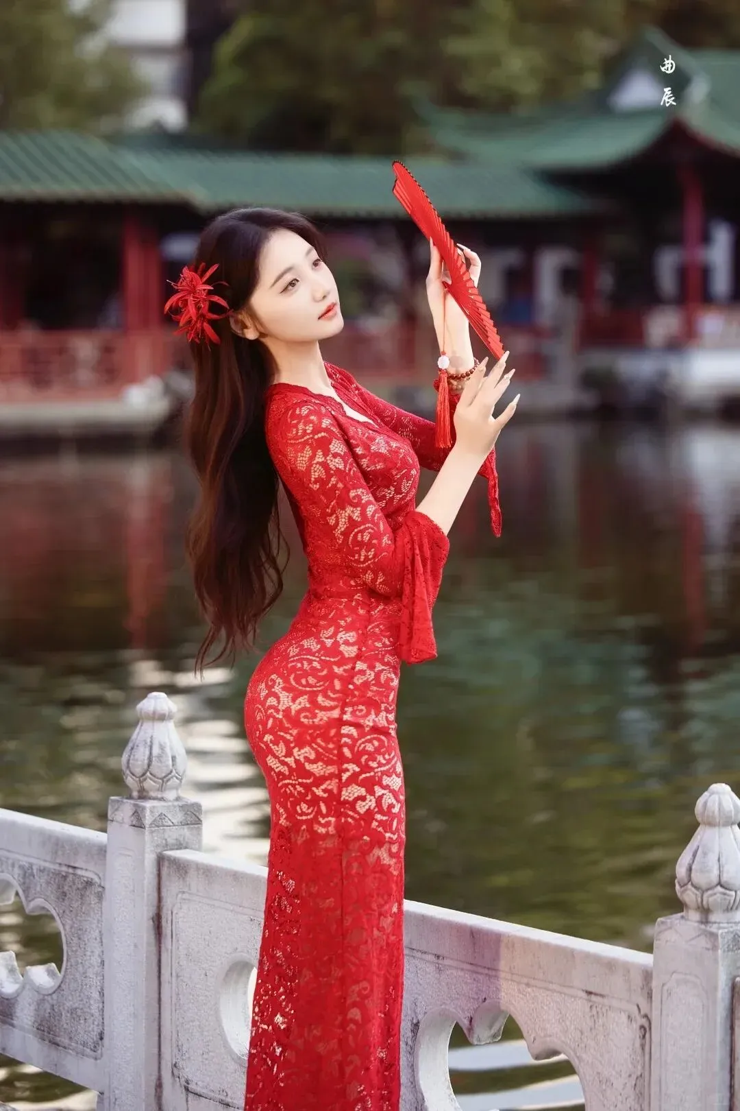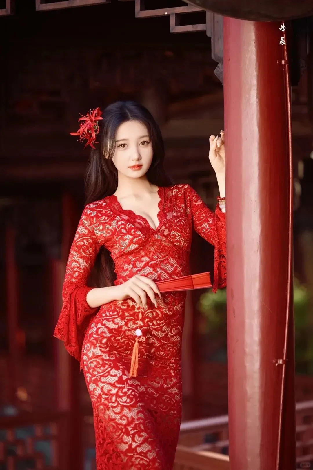 当朱红蕾丝掠过江南水榭的石栏,风里都裹着东方美人的韵致。