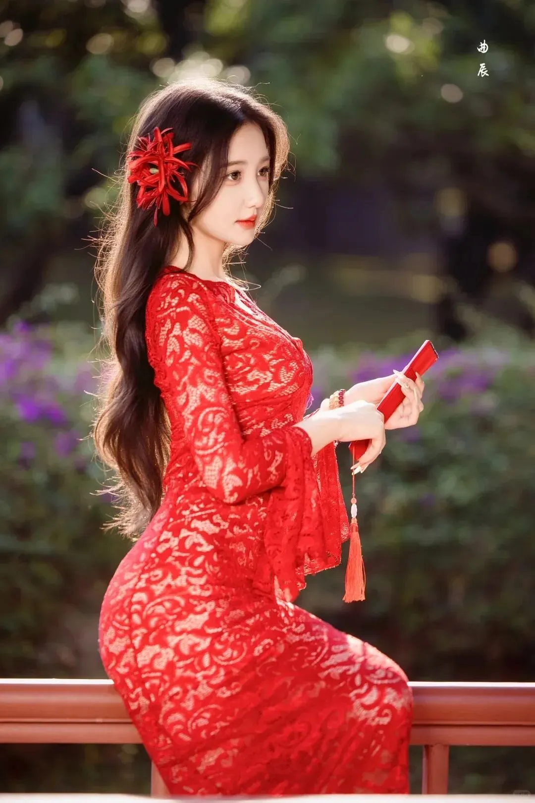 它不要求你裹成 “大家闺秀”,也不强迫你端着 “优雅架子”—— 你可以穿着它大笑,踩着它奔跑,把它当成一件普通的连衣裙,却在抬手投足间,自带中式女性的柔韧与力量。红色是热烈的勇气,蕾丝是柔软的表达,当你穿上它,不是变成别人眼里的 “旗袍美人”,而是找到属于自己的 “东方浪漫”。