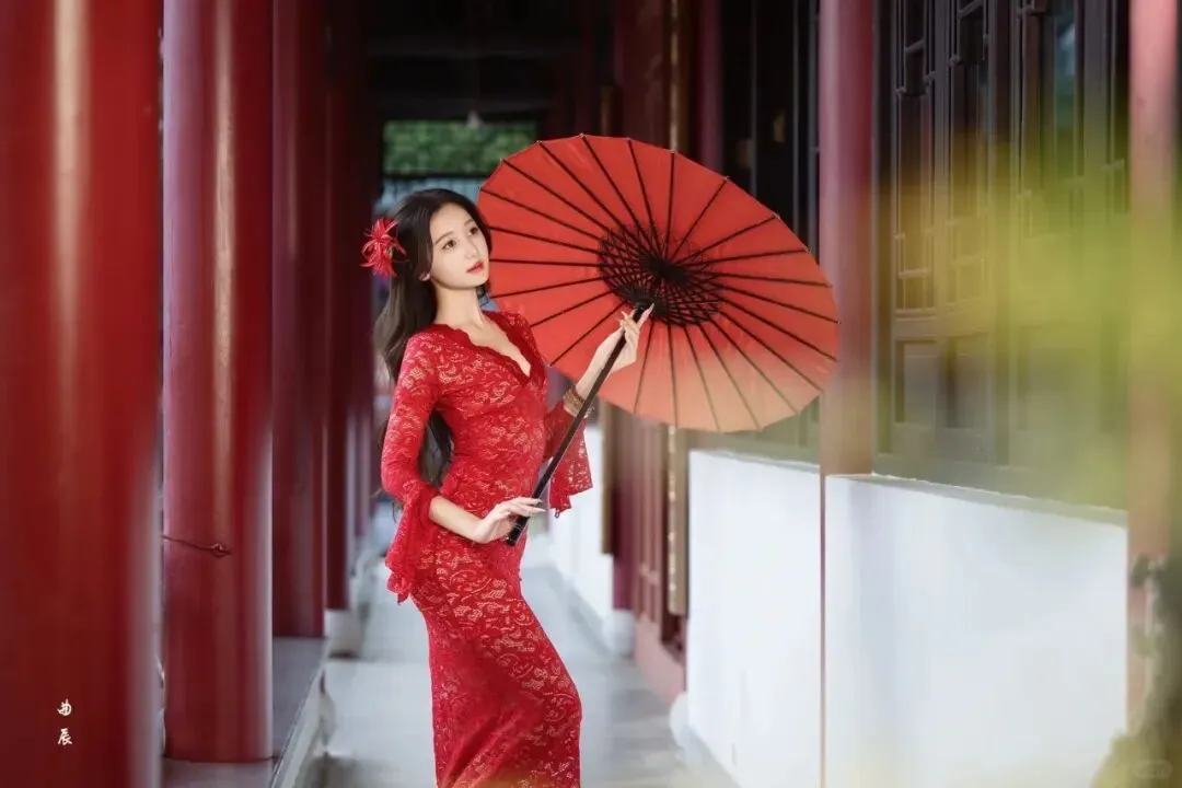 ✅ 选对场景:红柱、石栏、水榭、长廊这些中式元素,和红旗袍天生一对。避开拥挤的网红打卡点,找一处安静的园林角落,背景的灰瓦绿树会把红色衬得更高级。