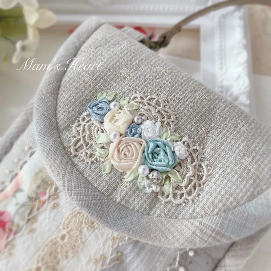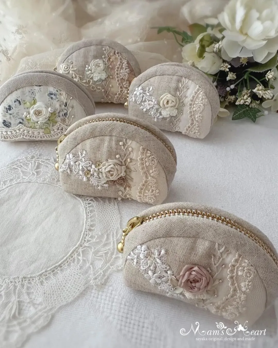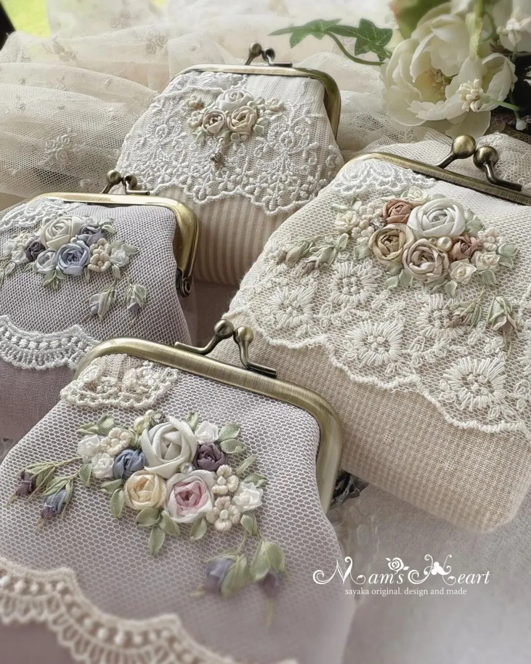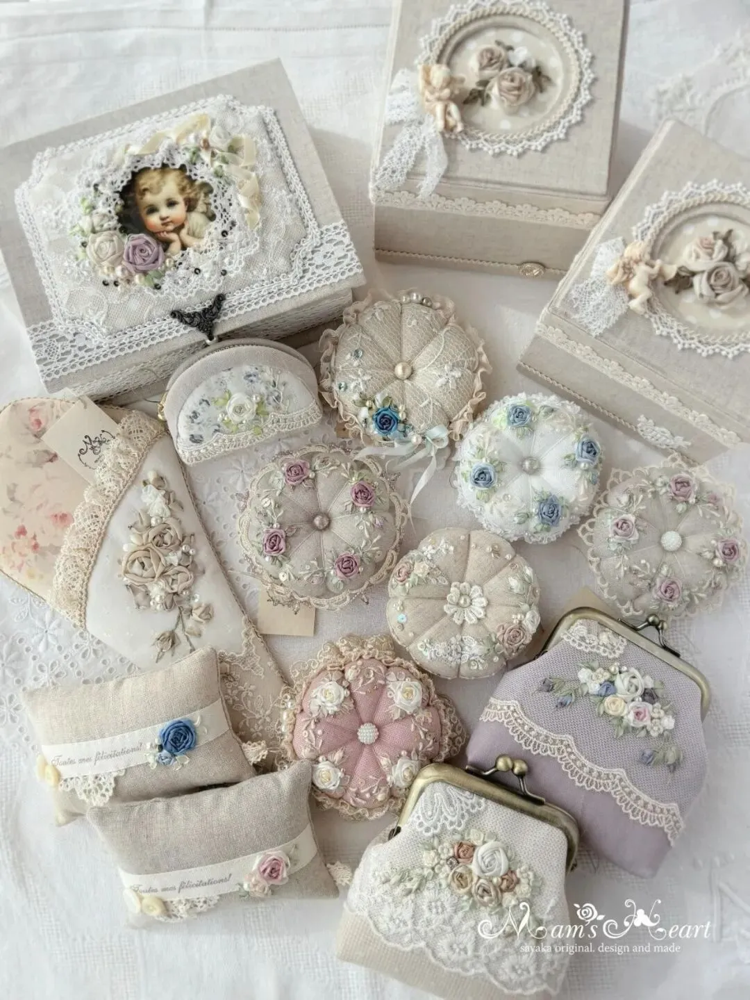 丝带绣折出鲜活花型,亚麻布拼碎花叠层蕾丝,复古昭和甜妹感拉满;珍珠、蝴蝶结巧思点缀,口金包、针插、小发饰件件精致,手工的温度全在细节里。