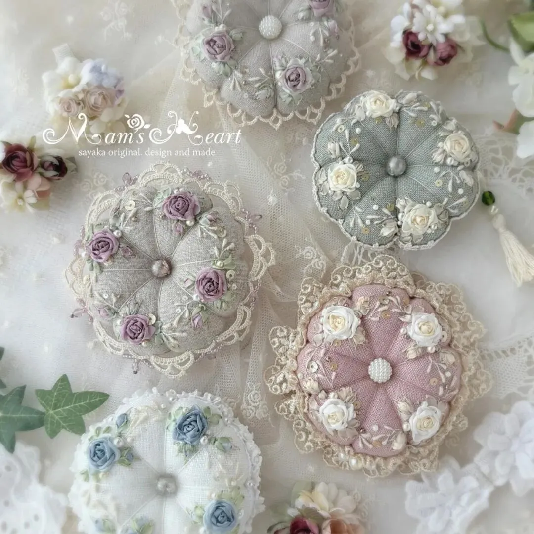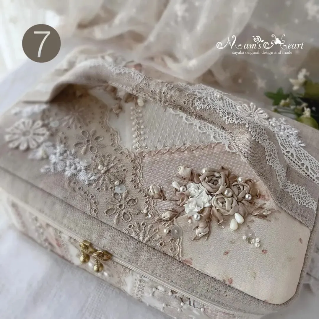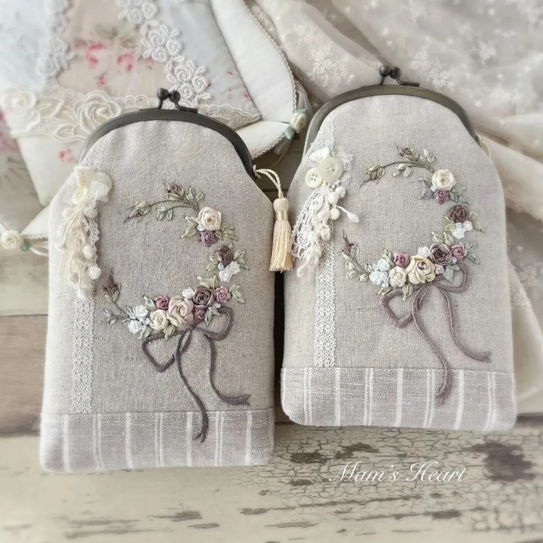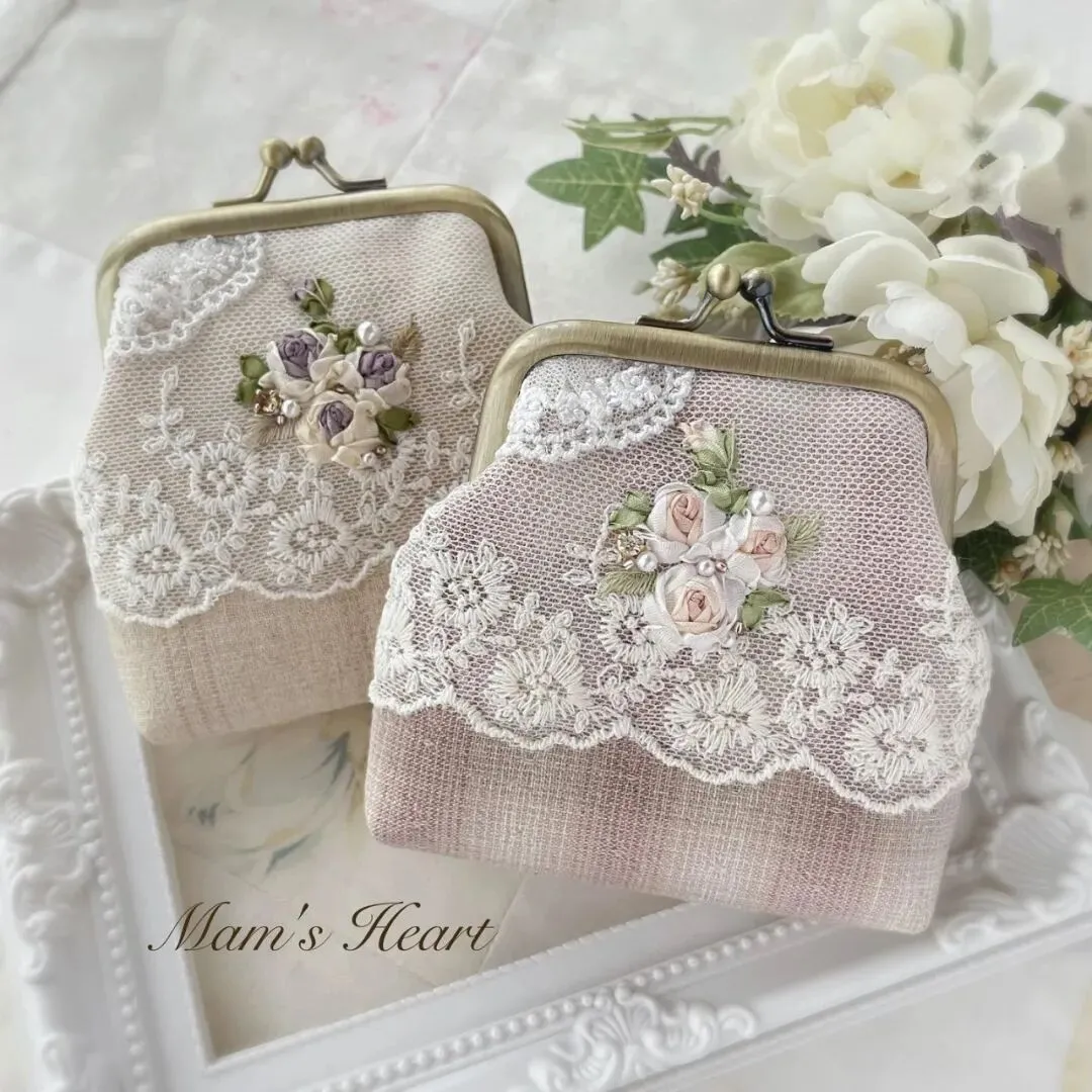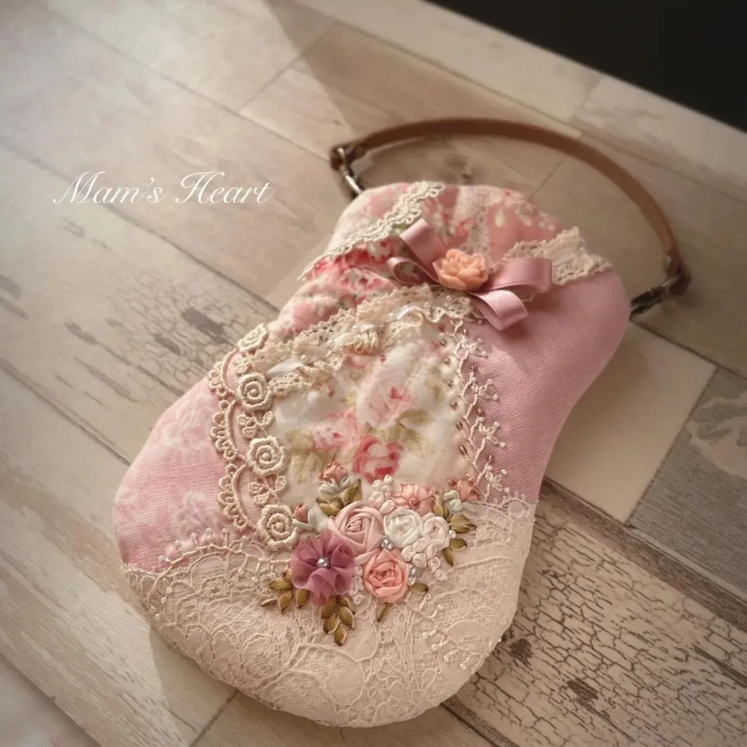 丝带绣折出鲜活花型,亚麻布拼碎花叠层蕾丝,复古昭和甜妹感拉满;珍珠、蝴蝶结巧思点缀,口金包、针插、小发饰件件精致,手工的温度全在细节里。