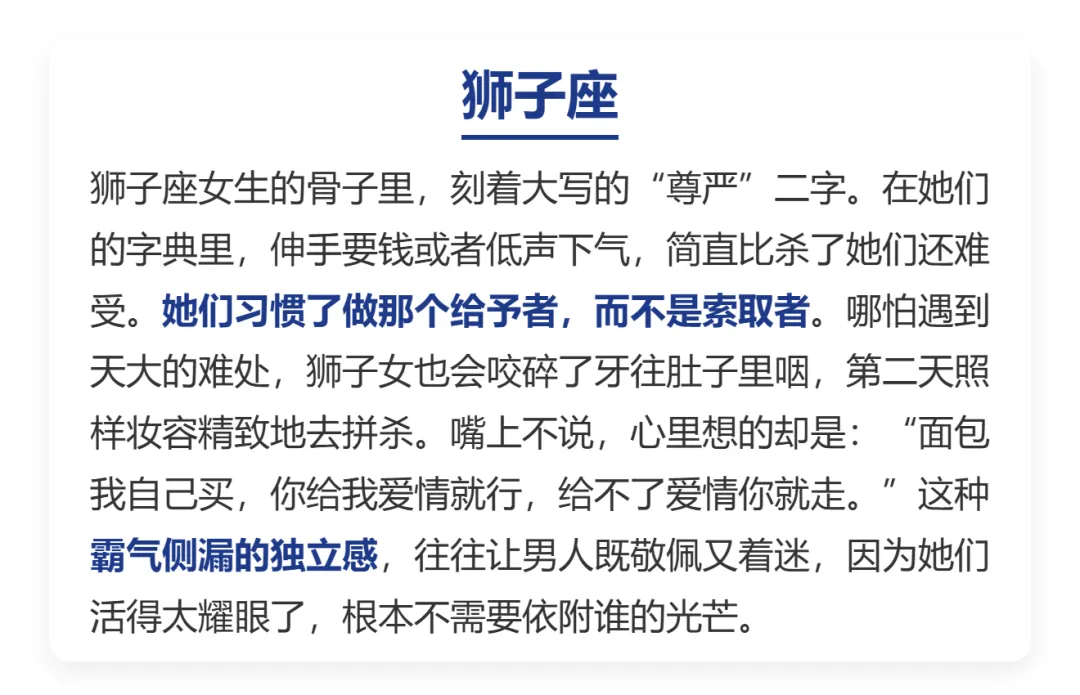 现在的.姑娘,真是一个.比一.个活得通.透。以前总.觉得女.人得有个.依靠,现在大.家明.白了,自己才是.那个.最稳的.靠山。这不.是逞强,也不是.没人.爱,而是因为.她们有.底气,也有那个.本事把.日子过得.热气.腾腾。今天咱.们就来.盘点一.下,哪三.个星.座的.女生,天生自.带这种“大女.主”光环,越独立.越让.人挪不.开眼。